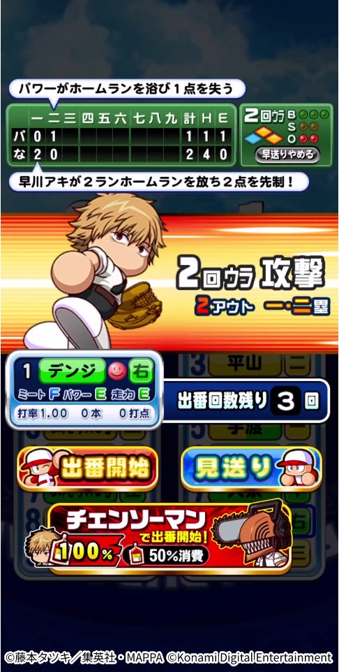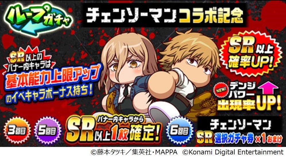 株式会社コナミデジタルエンタテインメントは、人気アニメ『チェンソーマン』とモバイルゲーム『実況パワフルプロ野球』(以下、『パワプロアプリ』)のコラボレーションが明日3月16日(木)メンテナンス終了後からスタートすることをお知らせします。