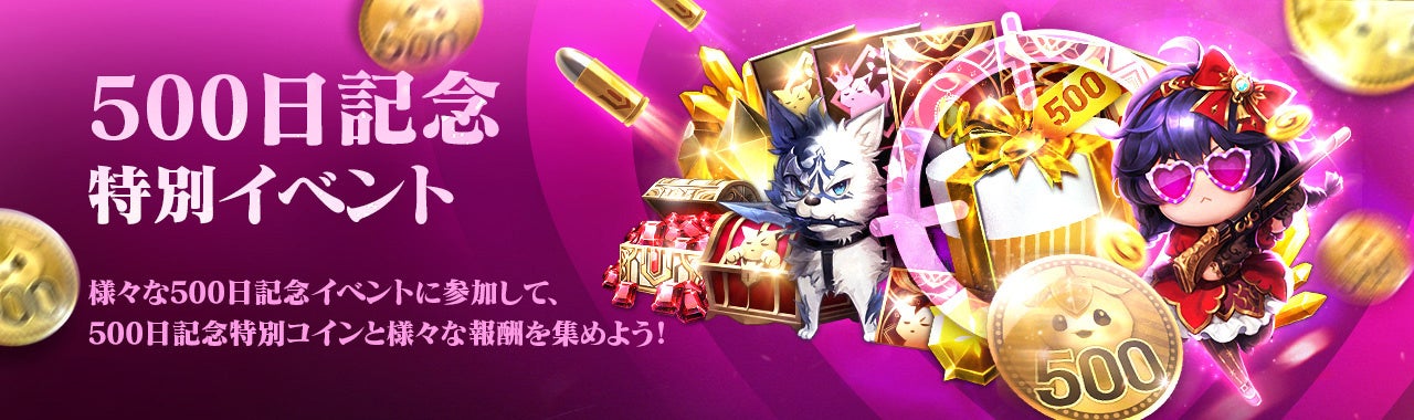 ペットの派遣や合成、ペットステップアップ召喚の利用などを通じて、500日記念特別コインやペット関連の多くの報酬を獲得できるイベントを開催いたします。