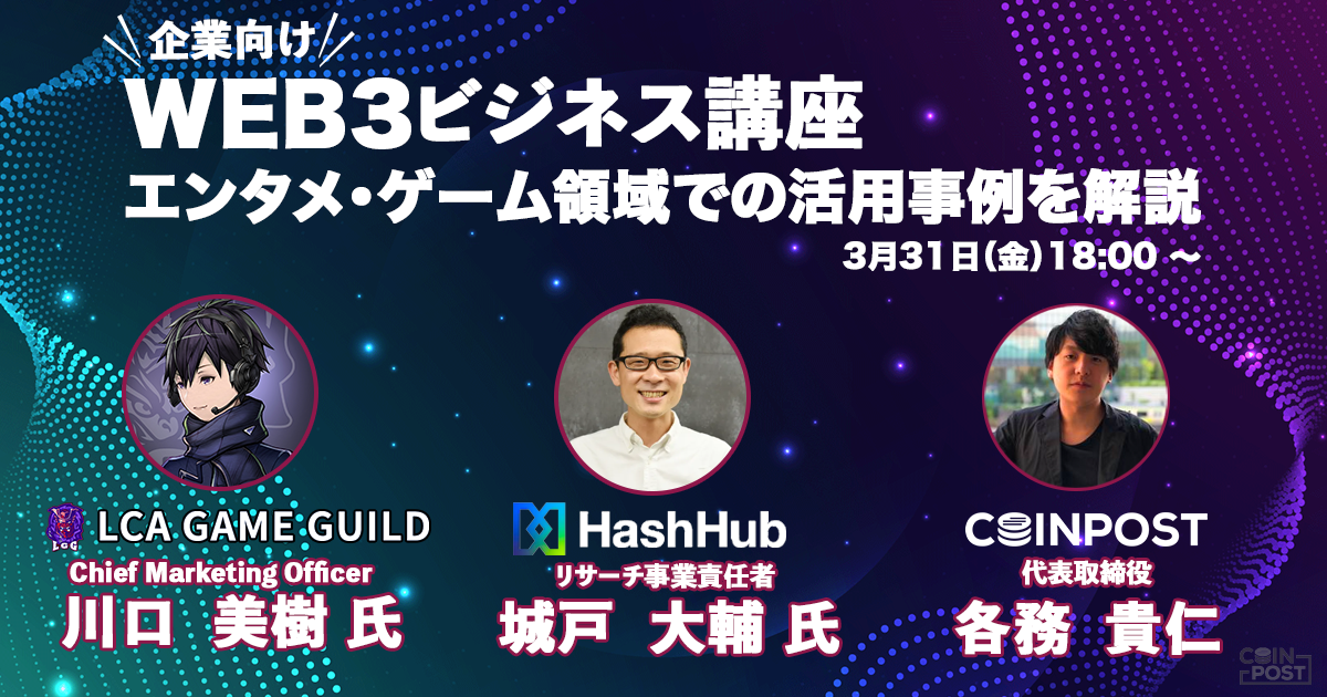 仮想通貨やブロックチェーンに関するニュースを専門に扱うオンラインメディア「CoinPost」を運営する株式会社CoinPost(本社:東京都荒川区、代表取締役CEO:各務 貴仁)は、国内事業者向けにWeb3に関する連続セミナーを毎月開催しています。3月31日(金)は「エンタメ・ゲーム業界Web3導入・活用事例」をメイントピックとするセミナーを開催いたします。