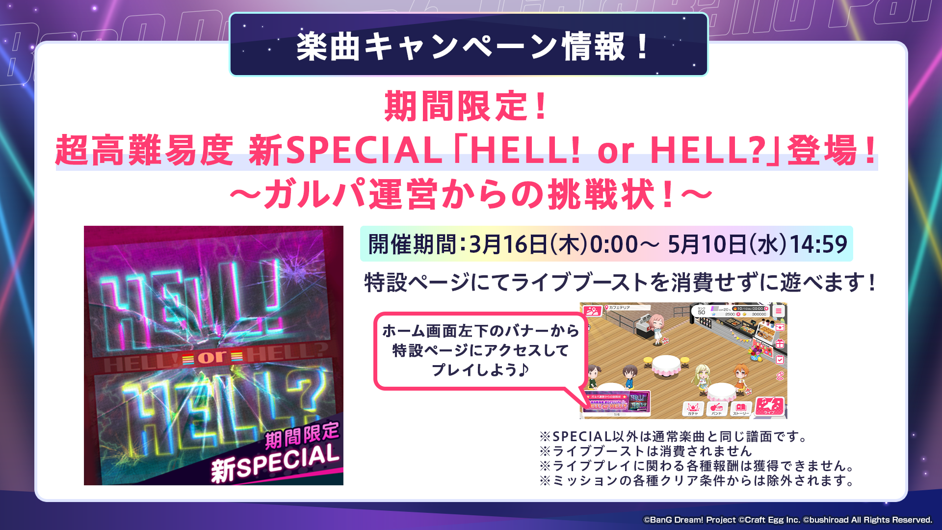 2023年3月16日(木)0時より、ガルパ運営からの挑戦状として、期間限定で超高難易度の新SPECIAL『HELL! or HELL?』が登場いたしました。ゲーム内のホームバナーより遷移できる特設ページにて、ライブブーストを消費することなくプレイすることができます。