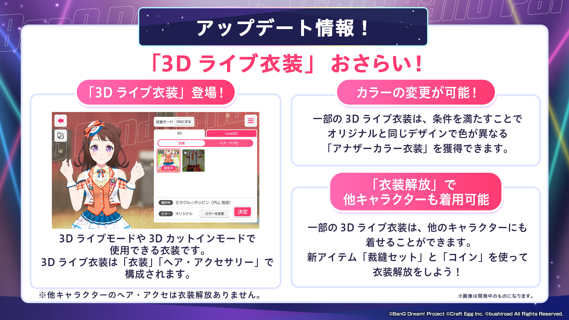 ガルパメンバーたちが3Dになって演奏する新しいモード「3Dライブモード」を追加いたしました。また、3Dライブモードや3Dカットインモードなどで登場する衣装やヘア・アクセサリーの着せ替えができる「3Dライブ衣装」が登場いたしました。衣装変更画面にて各キャラクターの「3Dライブ衣装」を設定することが可能です。