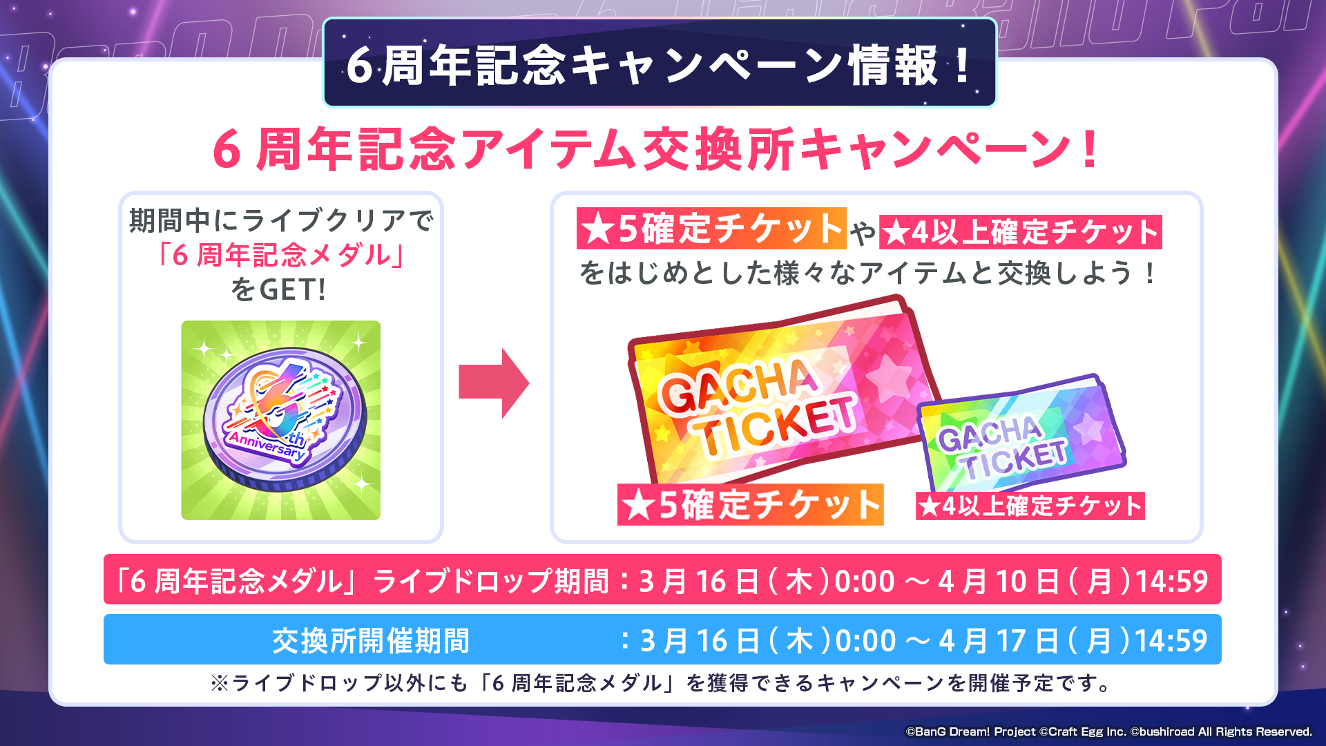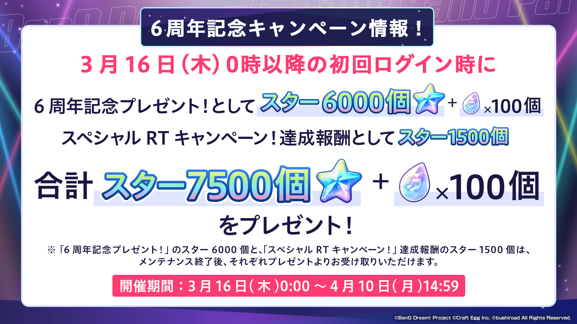 他にも様々な6周年を記念したキャンペーンなどを予定しております。詳細はゲーム内お知らせやガルパ公式Twitter(@bang_dream_gbp)、ガルパ6周年特設サイトをご確認ください。