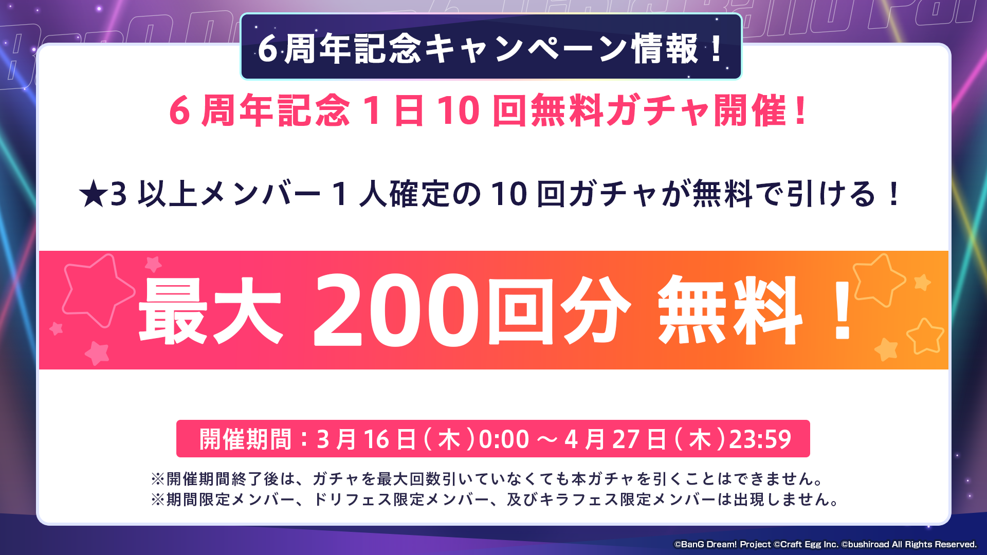 ★3以上のメンバー1人確定の「6周年記念1日10回無料ガチャ」を開催いたしました。2023年2月28日(火)よりTwitterにて開催していました「ガルパ超大型アップデート直前!スペシャルRTキャンペーン!」のリツイート数が達成したため、本ガチャは最大で200回分無料で引くことができます。詳細は、本ガチャ開催時のゲーム内お知らせをご確認ください。