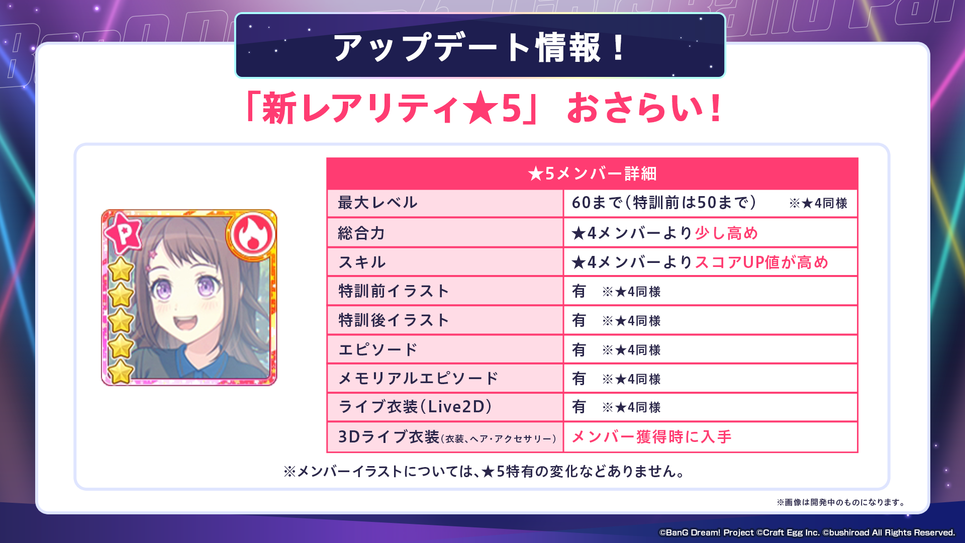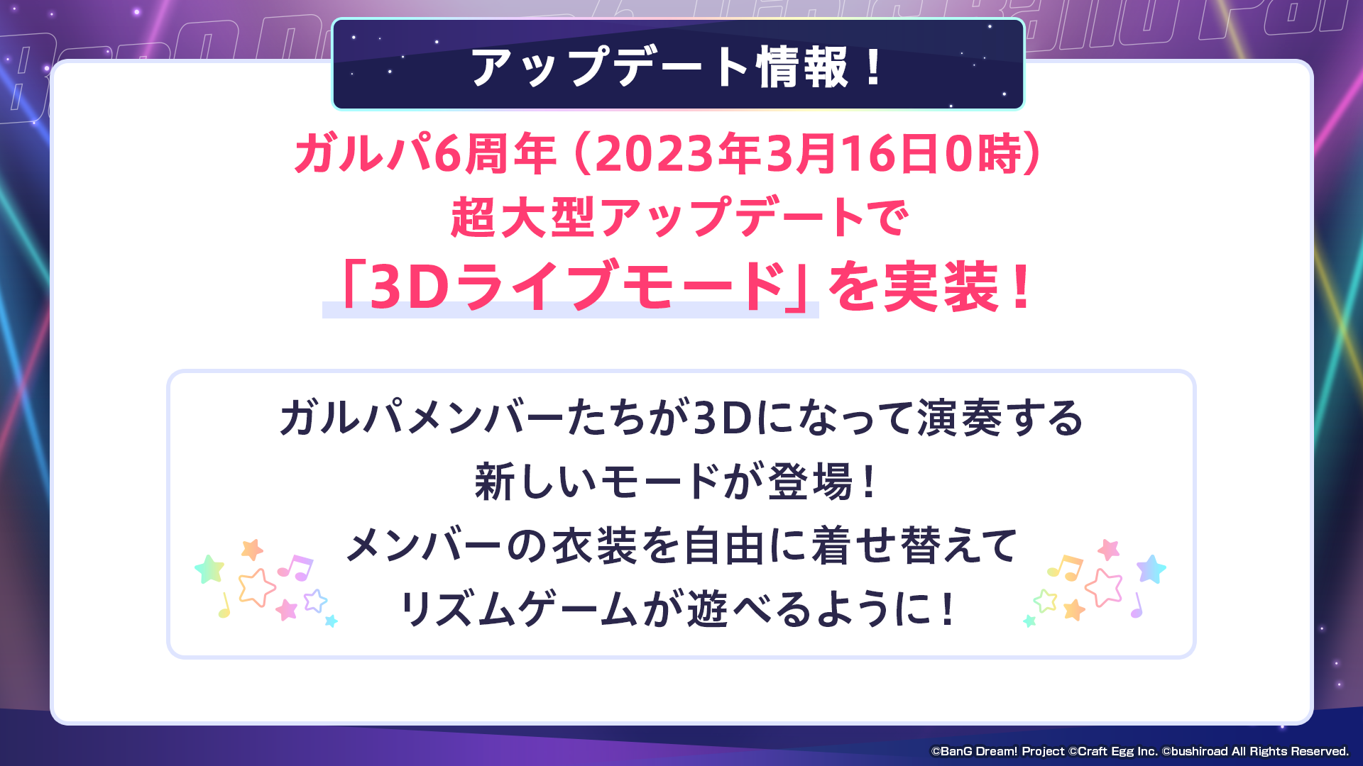 その他のアップデート内容や詳細につきましては、ゲーム内のお知らせ、またはガルパ6周年特設サイトをご確認ください。
