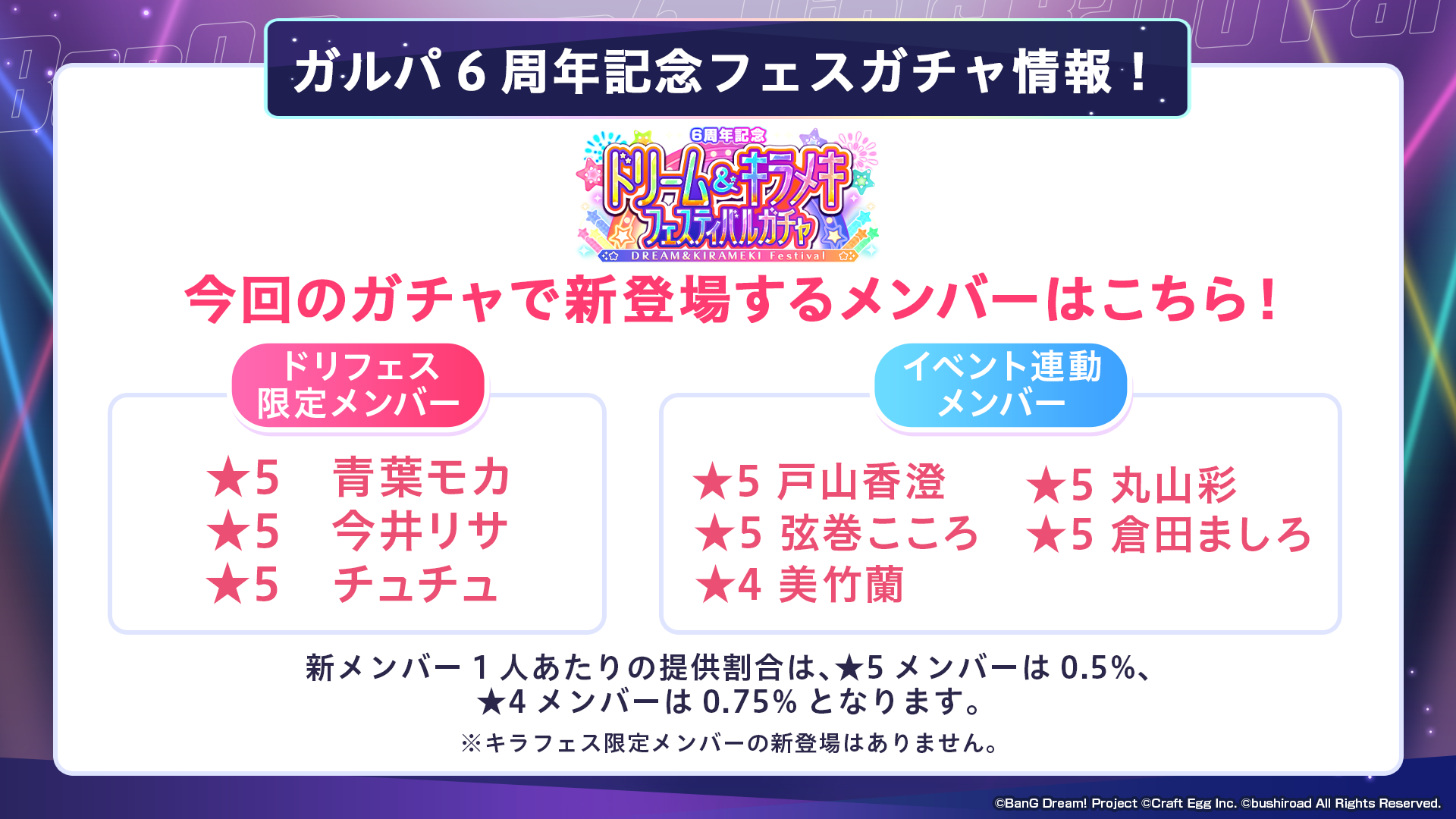 2023年3月16日(木)0時より、「6周年記念ドリーム&キラメキフェスティバルガチャ」を開催いたしました。新たなドリフェス限定メンバーとして、青葉モカ、今井リサ、チュチュが登場するほか、イベント連動の新メンバーとして、戸山香澄、丸山彩、弦巻こころ、倉田ましろ、美竹蘭が登場いたします。また、過去に登場したキラフェス限定メンバーも★5に変更し、本ガチャより登場いたします。
