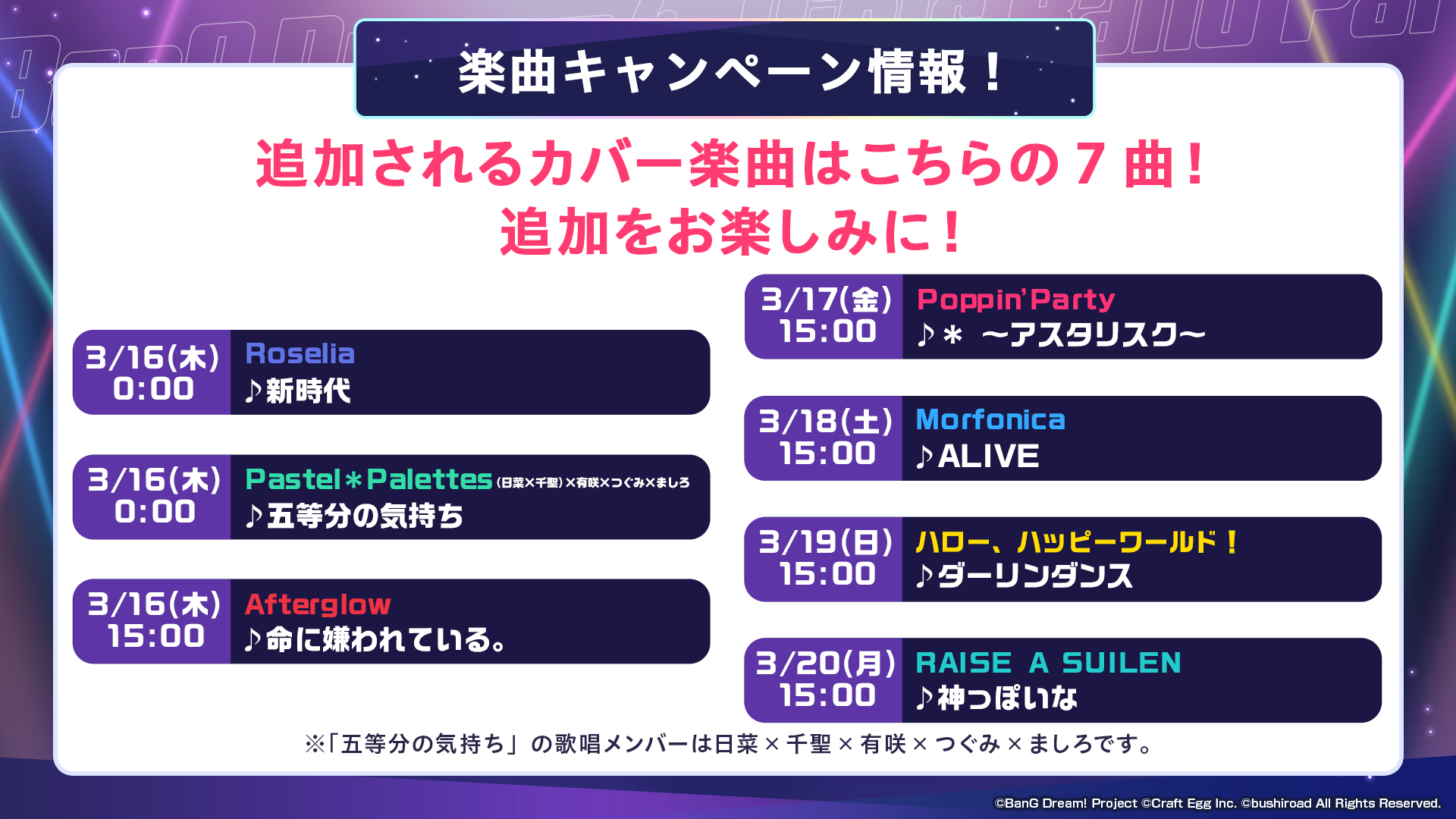 2023年3月16日(木)から3月20日(月)にかけて、合計7曲のカバー楽曲を順次ゲーム内に追加いたします。