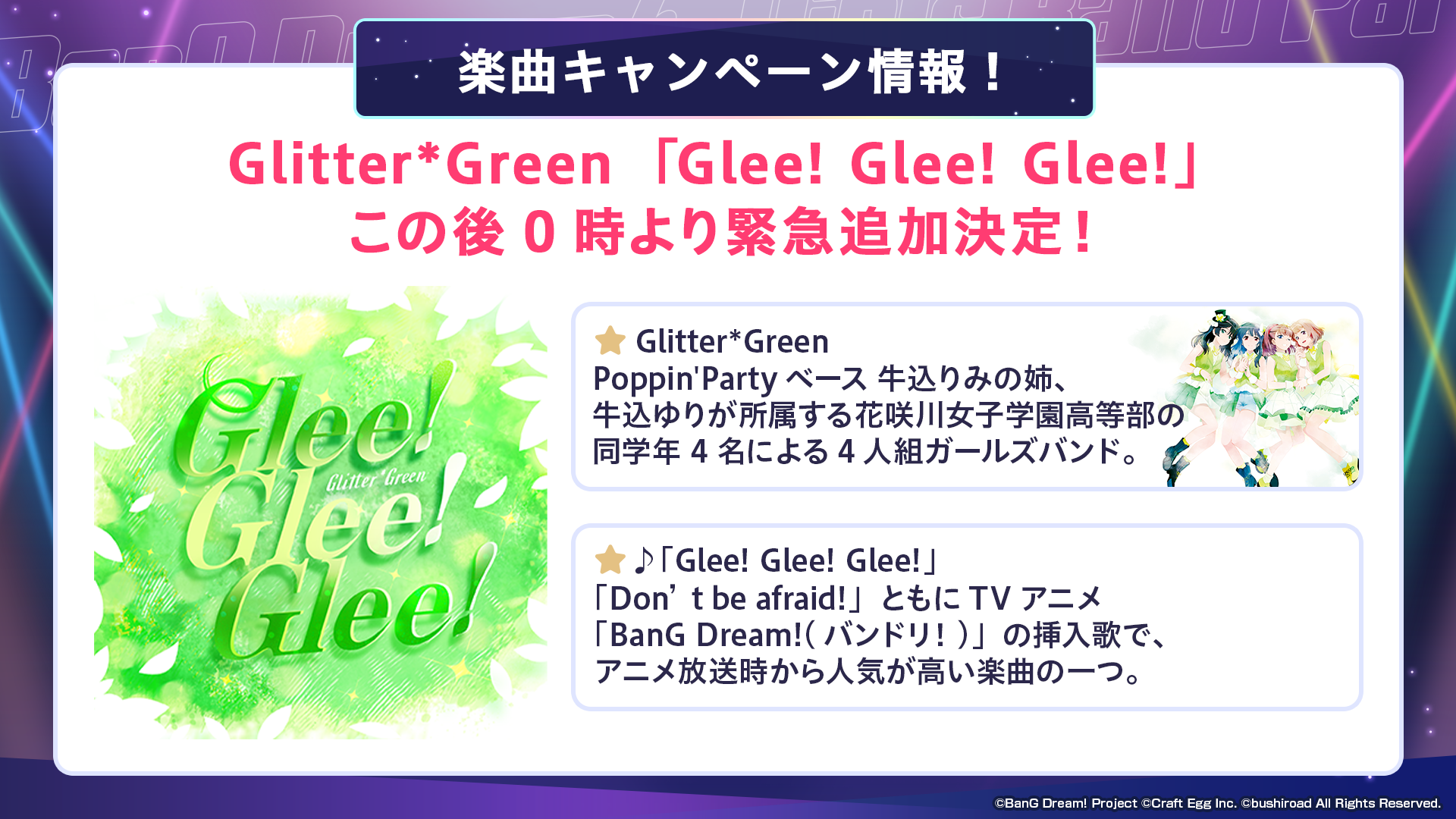2023年3月16日(木)0時より、TVアニメ「BanG Dream!(バンドリ!)」の挿入歌、Glitter*Greenオリジナル楽曲『Glee! Glee! Glee!』を追加いたしました。