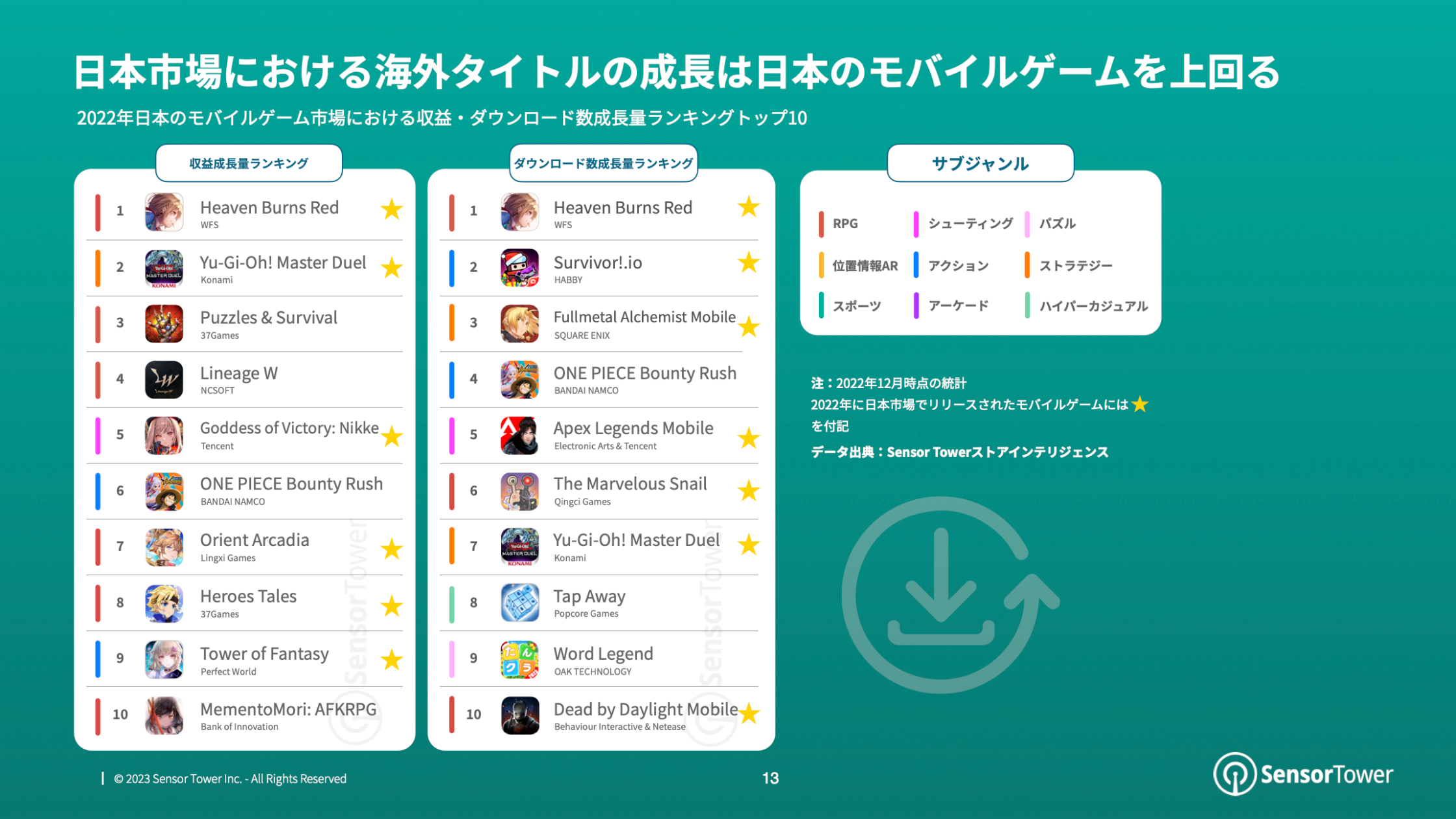 世界のモバイルゲーム市場に対する新型コロナウイルスの影響が弱まったことにより、2022年日本のモバイルゲーム収益は前年比約18%減の147億ドルとなり、2019年の水準に近づきました。このうち47%はRPGによる収益です。本レポートでは、2022年日本のモバイルゲームダウンロード数および収益の推移、日本市場で人気のモバイルゲームおよびトップパブリッシャーの実績、ならびに日本市場に進出した海外のモバイルゲームの実績について分析しているほか、ケーススタディを通じて2022年に日本で人気となった日本の新しいモバイルゲームや日本市場に進出した海外の人気モバイルゲームの成功例について、テーマ、プレイスタイル、広告等の面から紹介しています。