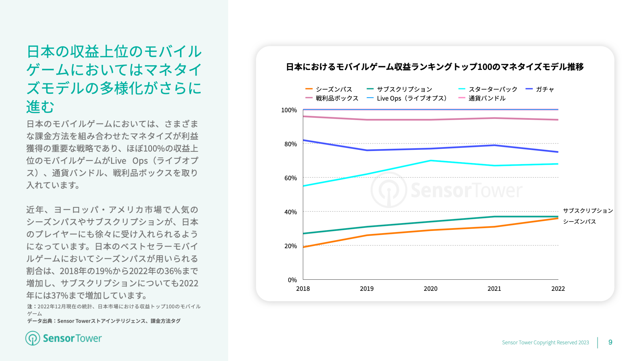 日本市場における収益上位のモバイルゲームは、ほぼ100%がLive Ops(ライブオプス)、通貨バンドル、戦利ボックス等の多様な課金方法を取り入れて収益を生み出しています。また、スターターパックおよびガチャもマネタイズモデルとしてよく目にします。近年は、ヨーロッパ・アメリカのモバイルゲーム市場で人気のシーズンパスおよびサブスクリプションについても徐々に日本のプレイヤーに受け入れられるようになりました。2022年の日本市場では、収益上位モバイルゲームの3分の1以上がシーズンパスを採用し、2018年の19%から大幅に増加しています。