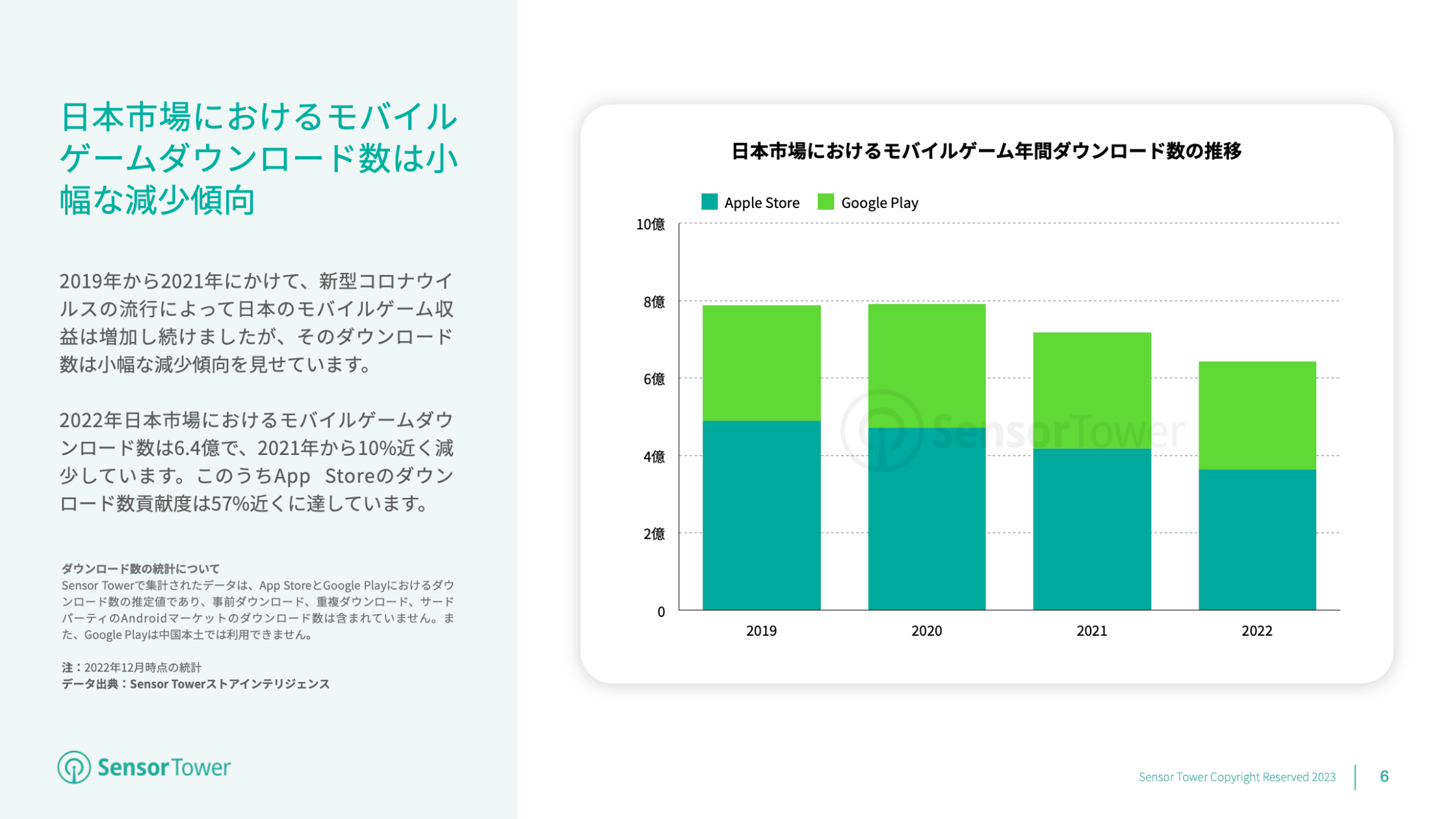 ダウンロード数については、2019年から2022年にかけて小幅な減少傾向を見せています。2022年、日本市場におけるモバイルゲームのダウンロード数は6.4億で、2021年から10%近く減少しています。