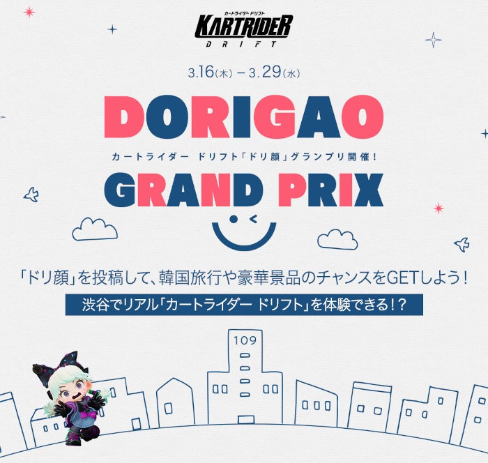 また、「リアル・カートライダー ドリフト」体験イベントの開催に合わせて、同イベント体験中の顔写真や動画などをSNSにご投稿いただくと、韓国ペア旅行などの豪華賞品が当たるキャンペーン「ドリ顔グランプリ」も開催いたします。