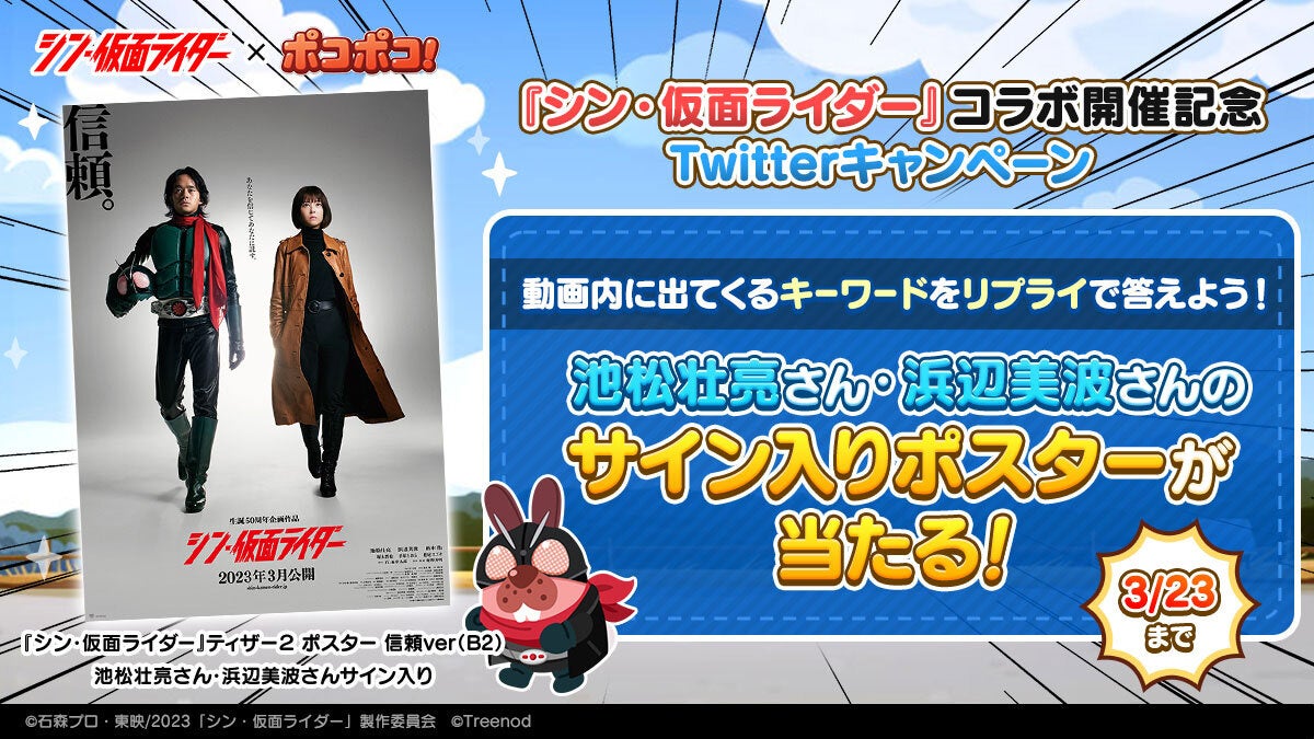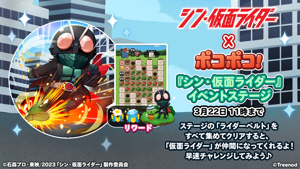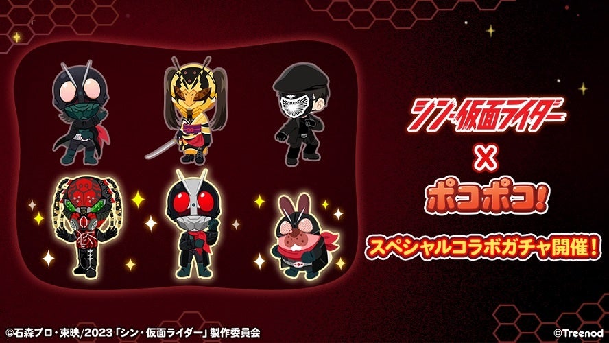 期間中、『シン・仮面ライダー』のキャラクターがゲーム内にコラボ限定仲間として登場します。「仮面ライダー」「仮面ライダー第2号」「SHOCKER下級構成員」「クモオーグ」「ハチオーグ」が登場。さらに、ポコタたちが『シン・仮面ライダー』に登場するキャラクターに扮した限定仲間「ライダーポコタ」「ルリ子スノー」も登場します。こちらはイベントステージやガチャなどから入手することが可能です。