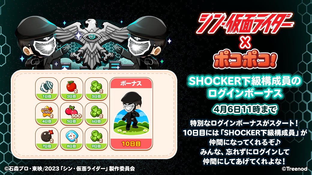 期間中、「LINE ポコポコ」にログインするだけで、クローバーやチェリーなどゲーム内アイテムをログイン報酬としてプレゼントします。さらに10日間ログインすると、コラボ限定仲間の「SHOCKER下級構成員」を仲間にできます。報酬は1日1回ずつ入手可能です。