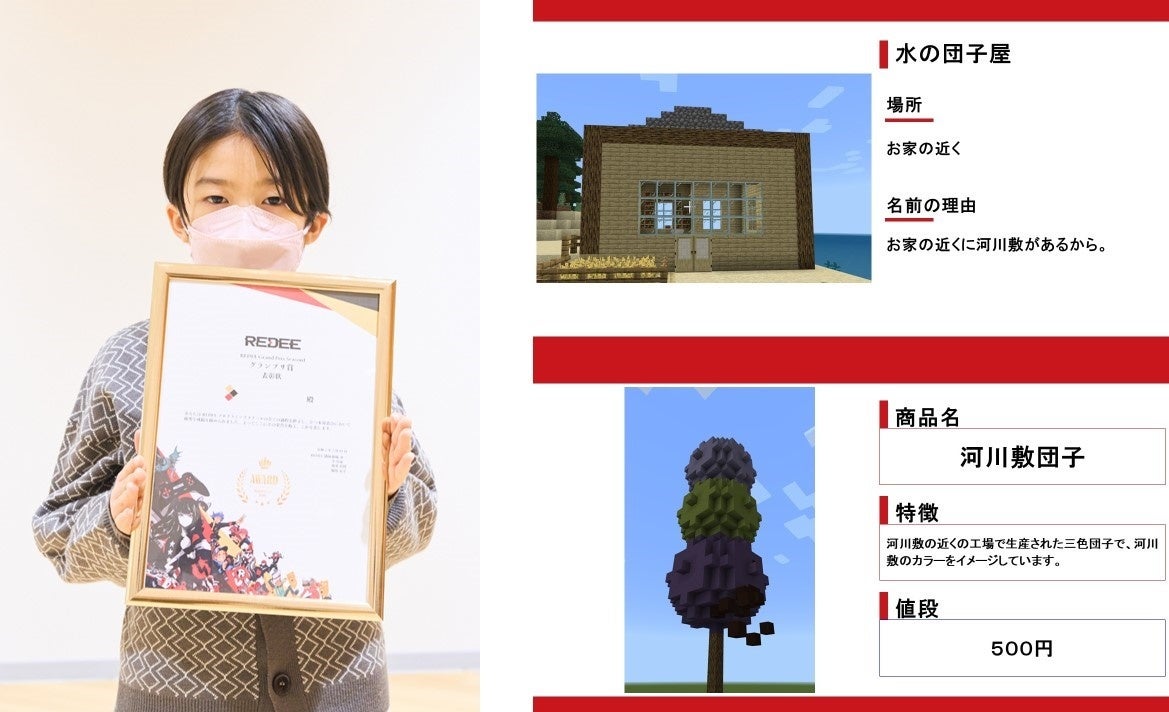 初のグランプリに輝いたのは、小学1年生の柳沢善さん。マインクラフトで「河川敷団子」という作品を作りました。課題の「おやつづくり」に対して、家の近くにある河川敷に「水の団子屋」というお店を作り、そこで販売する団子を制作。「河川敷団子」と命名し、「お客さんがこのお菓子を食べると、水を使うことのできない人もいるということを思い出してエコな行動するようになる。」という役割を与え、SDGsも意識した作品に仕上げました。小学1年生~小学6年生まで参加した今回の発表会ですが、最年少の小学1年生の受賞となりました。