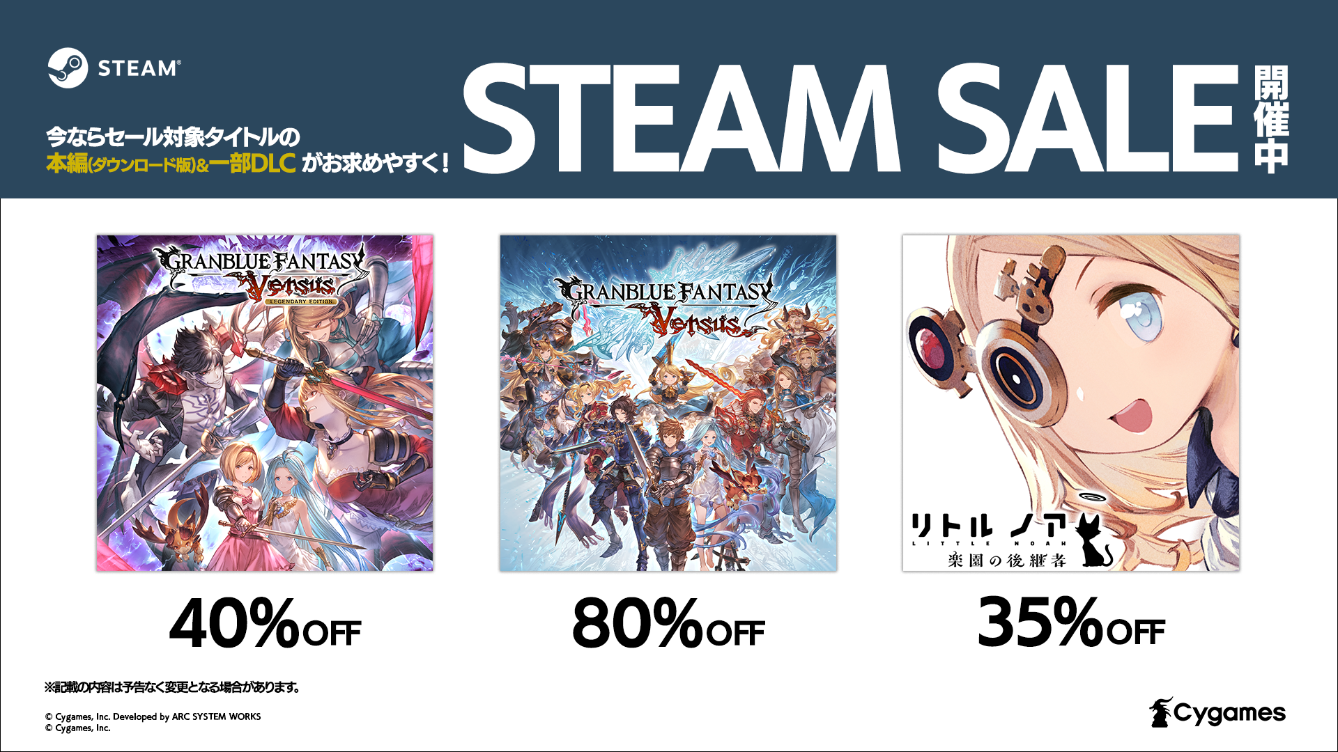 今回のセールでは、サイゲームスのコンシューマーゲームである『グランブルーファンタジー ヴァーサス』、『リトル ノア 楽園の後継者』のゲーム本編や、一部DLCが対象となります。ぜひこの機会にお楽しみください。