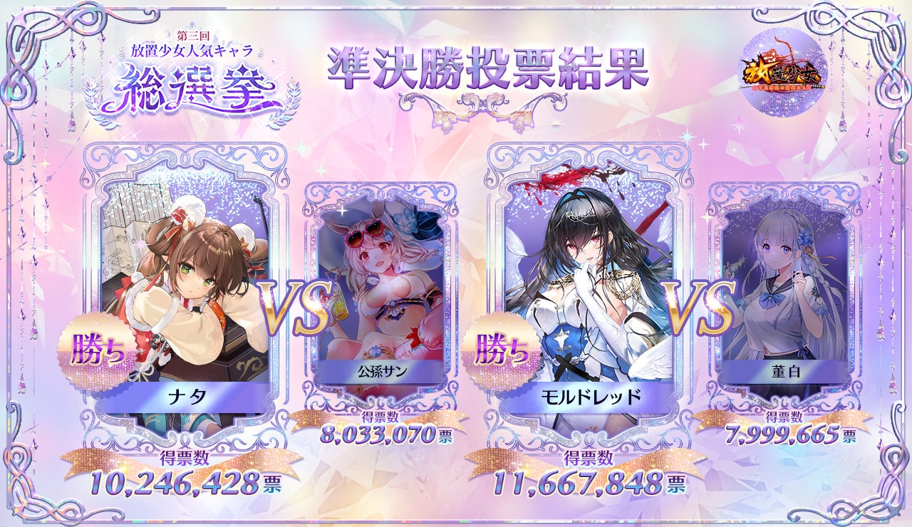 3月15日(水)〜3月16日(木)の間、「第三回放置少女人気キャラ総選挙」の準決勝が行われました。