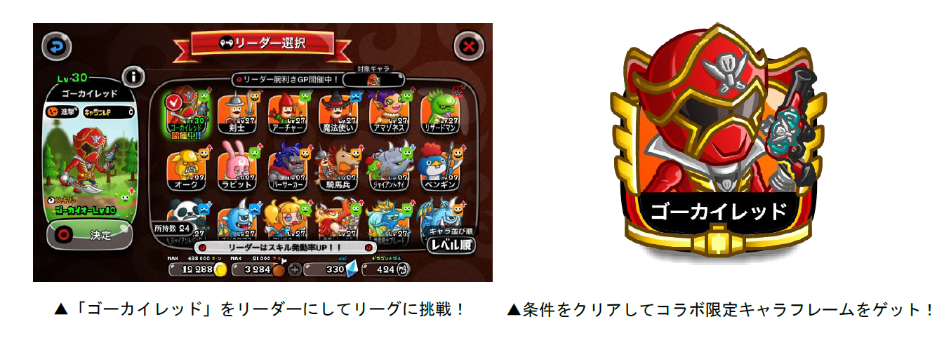 今回より新イベント「リーダー腕利きGP」を開催いたします。コラボ限定キャラ「ゴーカイレッド」をリーダーにしてリーグに挑みましょう。バトルに勝利してより多くの“キャラフレP”を獲得したランキング上位者や条件を達成した方には、コラボ限定“キャラフレーム”