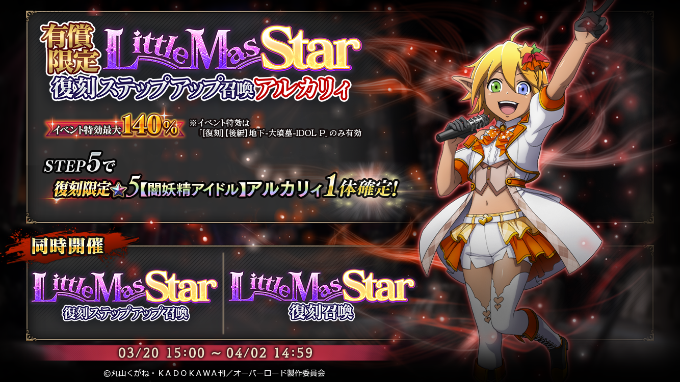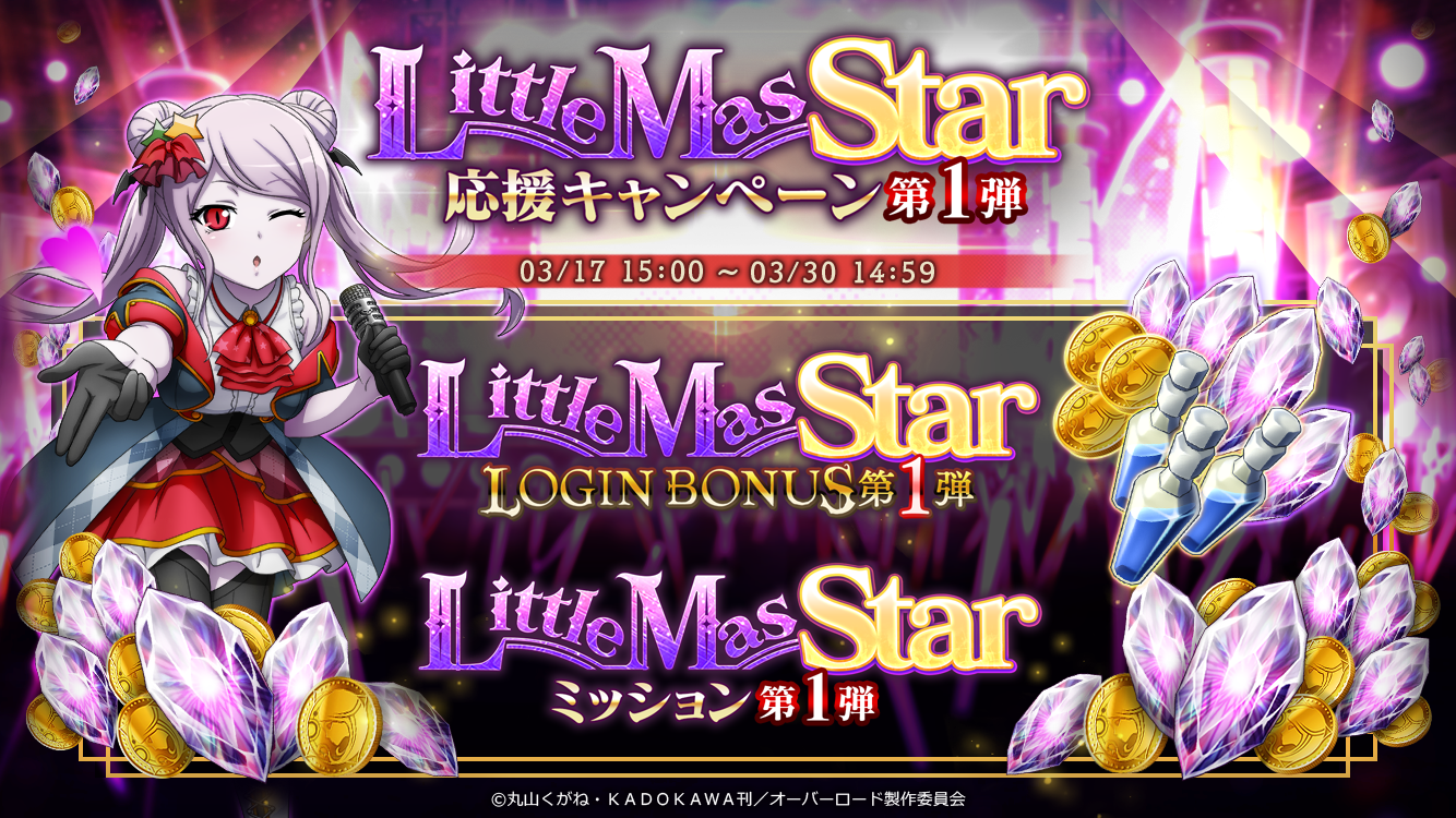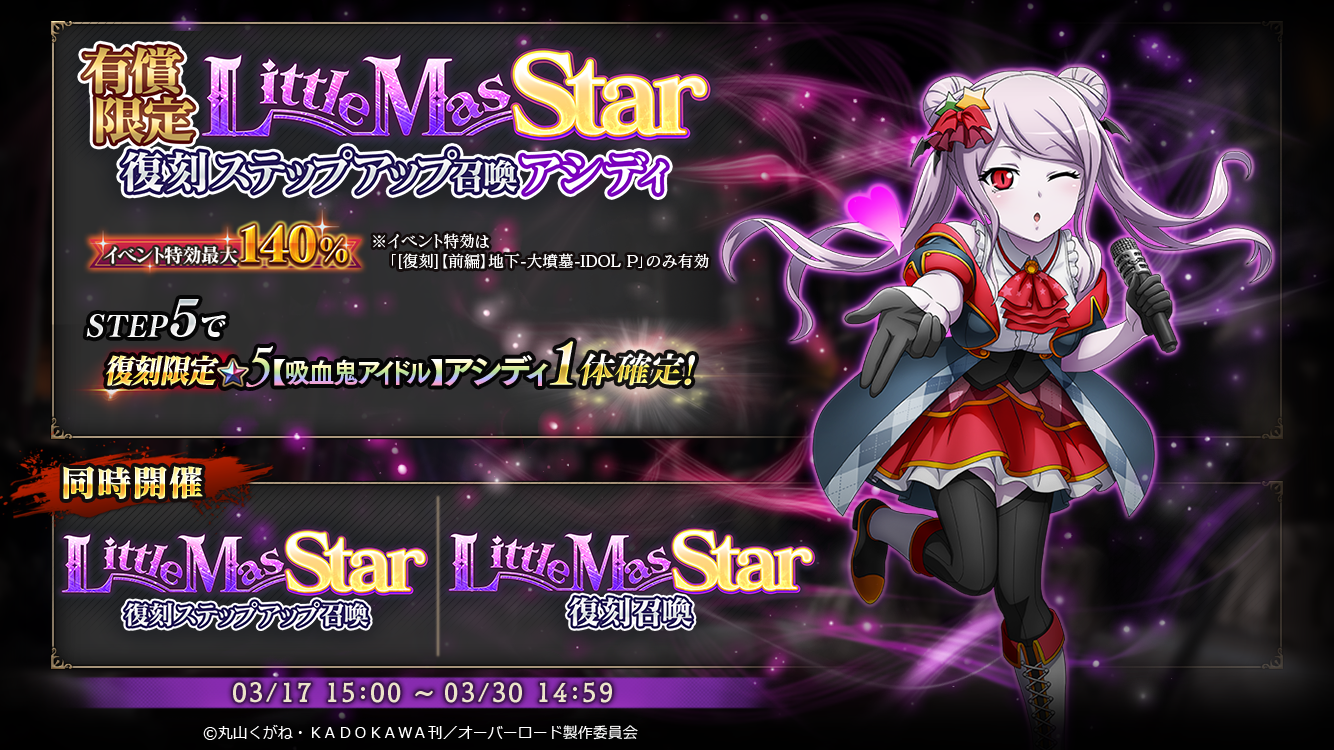 3/17より『LittleMasStar応援キャンペーン-第1弾-』を開催!ご好評いただいた『[復刻]【前編】地下-大墳墓-IDOL P』『[復刻]【後編】地下-大墳墓-IDOL P』を開催いたします!併せて、イベント連動召喚『有償限定LittleMasStar復刻ステップアップ召喚』『LittleMasStar復刻ステップアップ召喚』も実施!