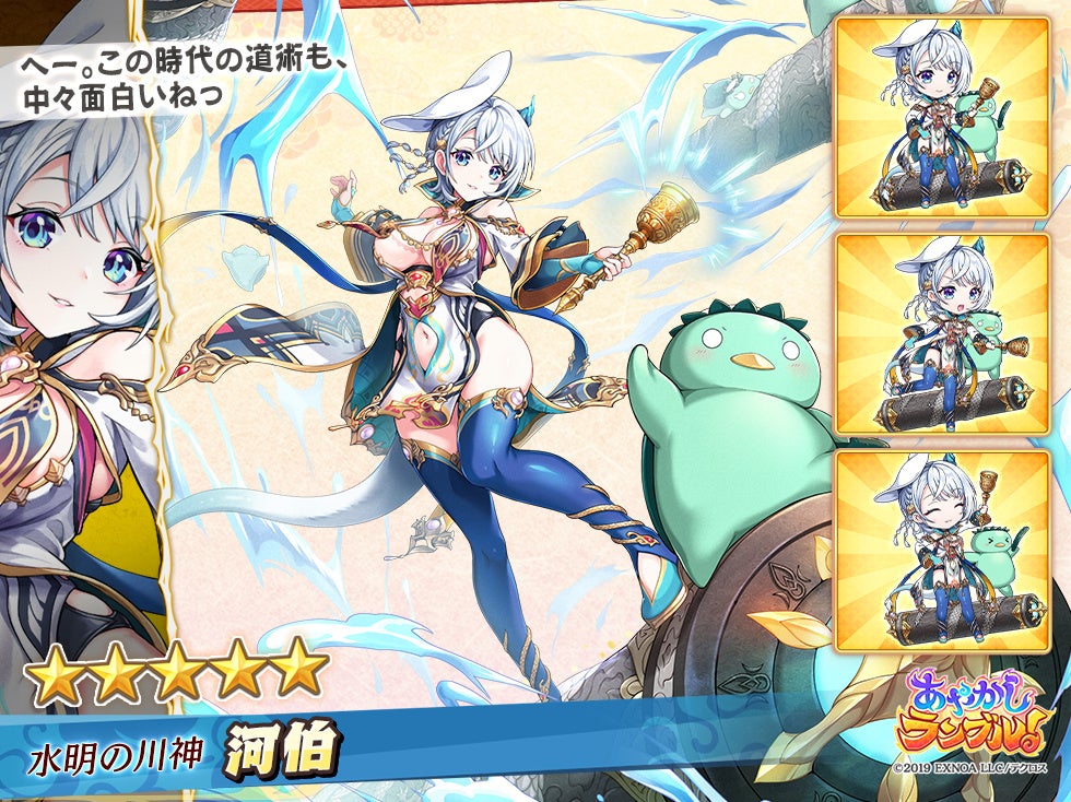 合同会社EXNOA(本社:東京都港区、CEO:村中 悠介、URL:https://games.dmm.com/)が運営するDMM GAMESにおいて、あやかし美少女たちと冒険する、迎撃型爽快スキルバトルRPG『あやかしランブル!』(https://ayarabu.jp/)は、3月17日に、新たに「★5 河伯」「★5 アンナ」が登場しました。さらに式神との絆を深めていく「真華の契り」の対象式神に「★5 フツノミタマ」が追加。『守護五天確定!無料100連召喚』も開催中です。