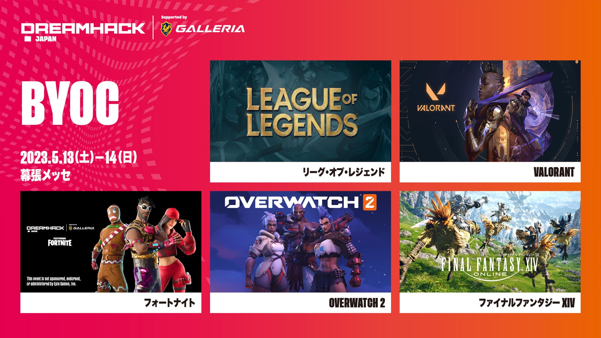 BYOCでは、「リーグ・オブ・レジェンド」「VALORANT」「フォートナイト」「OVERWATCH 2」「ファイナルファンタジーXIV」の5つの大人気タイトルにおいて、DreamHack Japanの主催による大会開催が決定しました。各大会の詳細については、後日お知らせいたします。