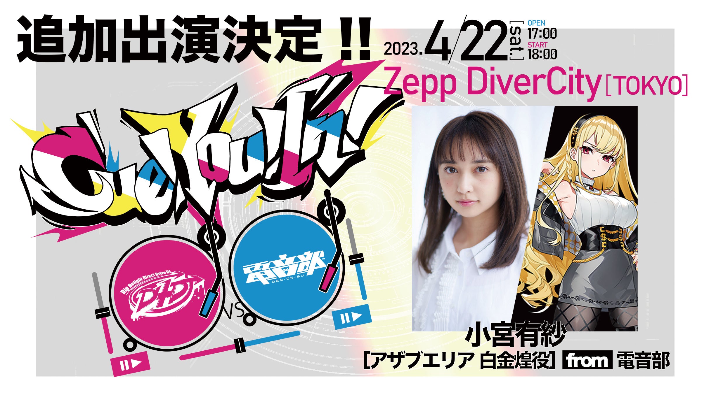 株式会社HIKE(本社:東京都新宿区、代表取締役:三上 政高/梁 俊模)が主催する「Cue! You! In! 〜D4DJ vs 電音部〜」(日程:4月22日、会場:Zepp DiverCity TOKYO)に、追加キャストとして小宮有紗(アザブエリア、白金煌役)さんの出演が決定しました。