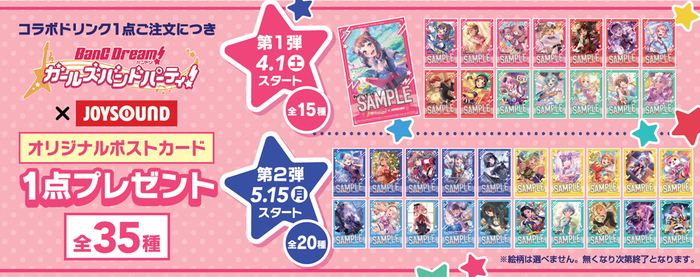 コラボドリンクには、「バンドリ! ガールズバンドパーティ!」の各バンドをイメージした「Poppin‘Party」「Afterglow」「Pastel*Palettes」「Roselia」「ハロー、ハッピーワールド!」「Morfonica」「RAISE A SUILEN」の全7種をご用意します。注文特典として、コラボドリンク1品ご注文につき、オリジナルポストカードを全35種【第1弾15種/第2弾20種】の中からランダムで1枚プレゼントします。