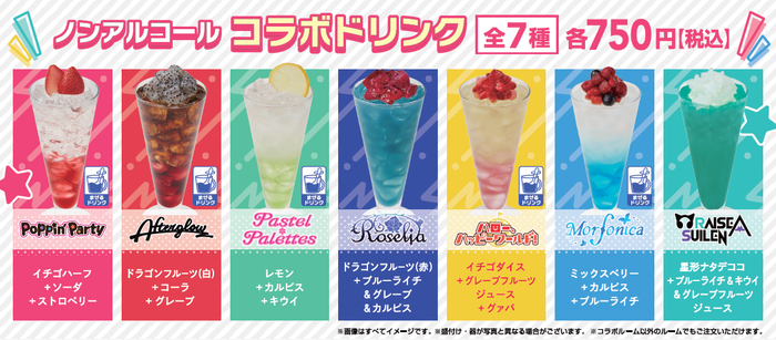 コラボドリンクには、「バンドリ! ガールズバンドパーティ!」の各バンドをイメージした「Poppin‘Party」「Afterglow」「Pastel*Palettes」「Roselia」「ハロー、ハッピーワールド!」「Morfonica」「RAISE A SUILEN」の全7種をご用意します。