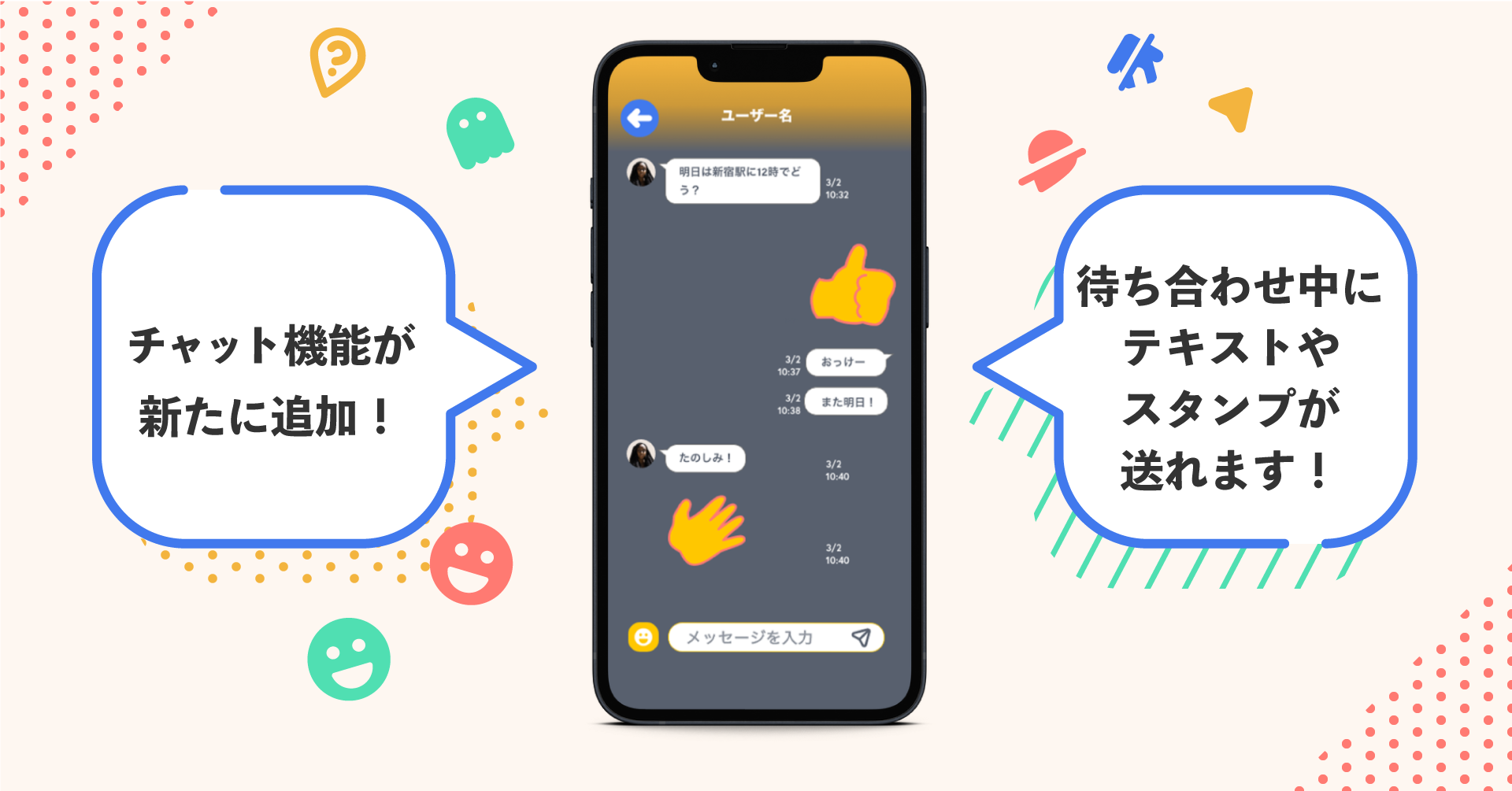 新たに追加されたSilentLogのチャット機能では、テキストとスタンプを使ったやり取りが可能です。人が多い場所での待ち合わせでは、位置情報だけでは困難な場面もあります。チャット機能を搭載することで、より便利な待ち合わせ体験を提供します。
