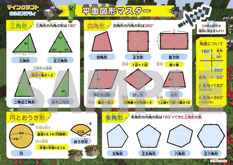 出版物の制作販売を行う株式会社西東社(東京都文京区、代表取締役:若松和紀)は、2023年3月22日『マインクラフトでおふろスタディ かけざん九九ひょう&算数ポスター』を全国の書店・Amazonなどのネット書店で発売しました。大人気ゲーム「マインクラフト」で楽しく算数の基礎を身につけることができるお風呂ポスターで、かけざんや九九、単位の計算、分数、図形の公式など全8種類の充実した内容です。