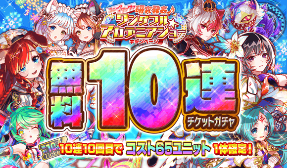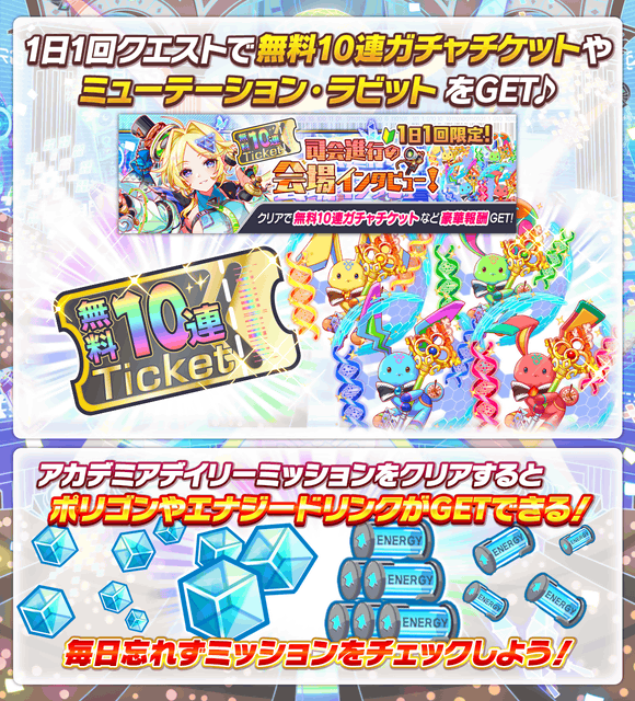 毎日クリアすることで、『無料10連チケットガチャ』が最大150連分ひける!!