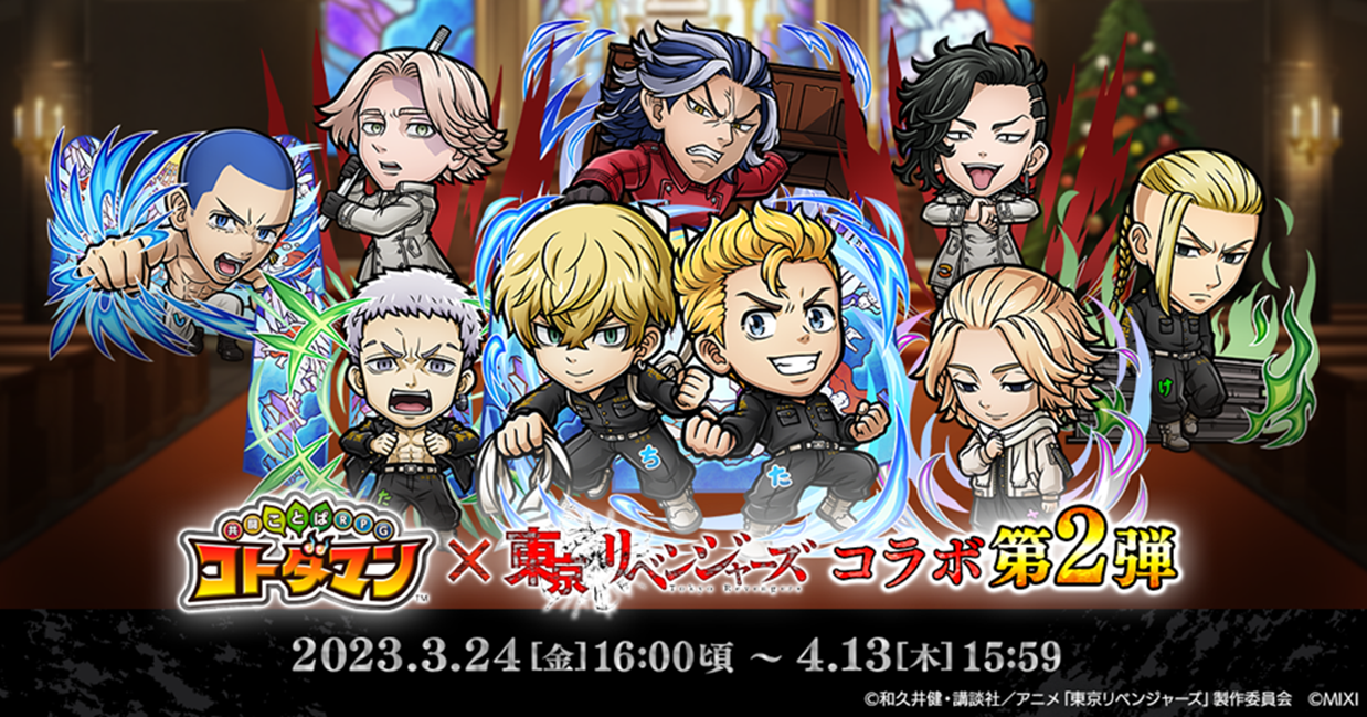 株式会社MIXI(東京都渋谷区、代表取締役社長:木村 弘毅)は、スマホアプリの「ことば」で闘う新感覚RPG「共闘ことばRPG コトダマン」(以下コトダマン)において、TVアニメ『東京リベンジャーズ』とのコラボ第2弾を、本年3月24日(金)より開催します。
