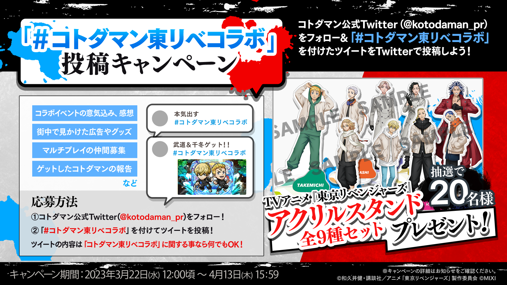 コトダマン公式Twitterをフォローし、「#コトダマン東リべコラボ」を付けてツイートを投稿した方の中から抽選で20名様に「TVアニメ『東京リベンジャーズ』アクリルスタンド全9種セット」をプレゼントします。