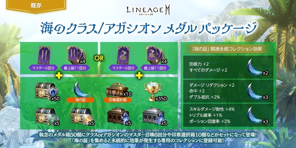 「執念のメダル箱(刻印)」50個に、クラスまたはアガシオンのマスター召喚66回分と最上級召喚44回分、「海の証(刻印)」1個などがセットになった「海のクラス/アガシオン メダル パッケージ」が登場しました。