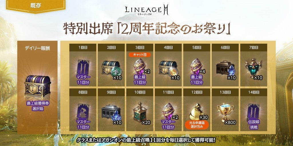 毎回もらえる「天使の最上級獲得券選択箱(刻印)」1個のほか、「執念の伝説級クラス挑戦券(1回)(刻印)」や「執念のマスター クラス/アガシオン獲得券(11回)(刻印)」などのアイテムを受け取ることができます。