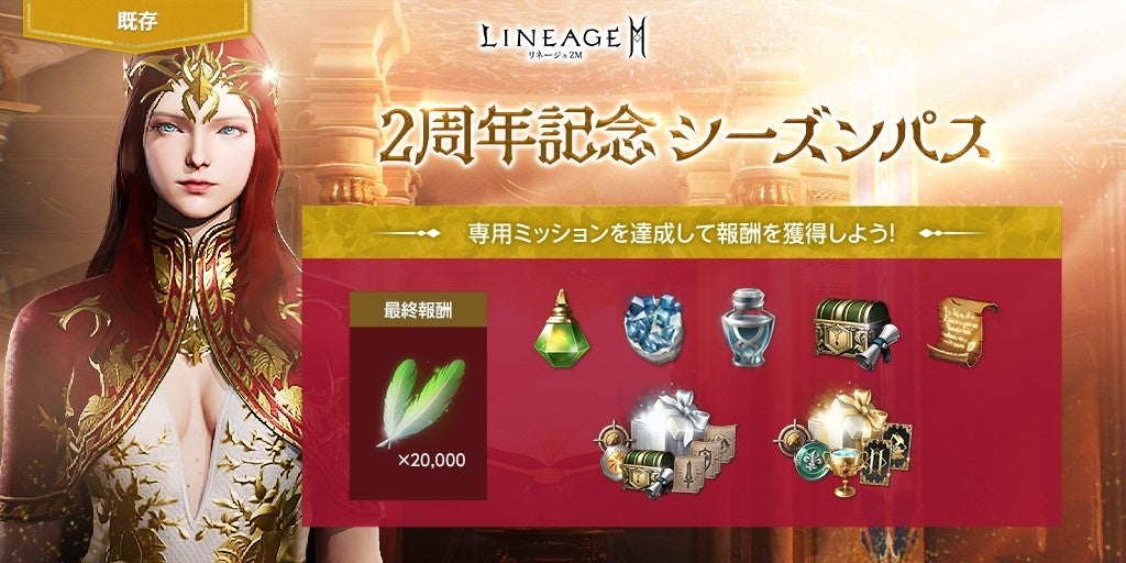期間中、毎日達成していくデイリー ミッションと2週間でクリアを目指すシーズン ミッションで構成された、新規シーズンパス「2周年記念シーズンパス」が登場します。デイリー ミッション、シーズン ミッションをそれぞれ達成してシーズンパス EXPを獲得し、パス レベルを上昇させることで、「2周年の感謝のプレゼント箱(イベント)」や「魔力が宿った羊皮紙(刻印)」など、様々なアイテムを報酬として獲得することができます。また、1,000,000アデナを使用することでプレミアム報酬を有効化することができます。最終報酬として、「アインハザードの祝福」20,000を獲得することが可能です。