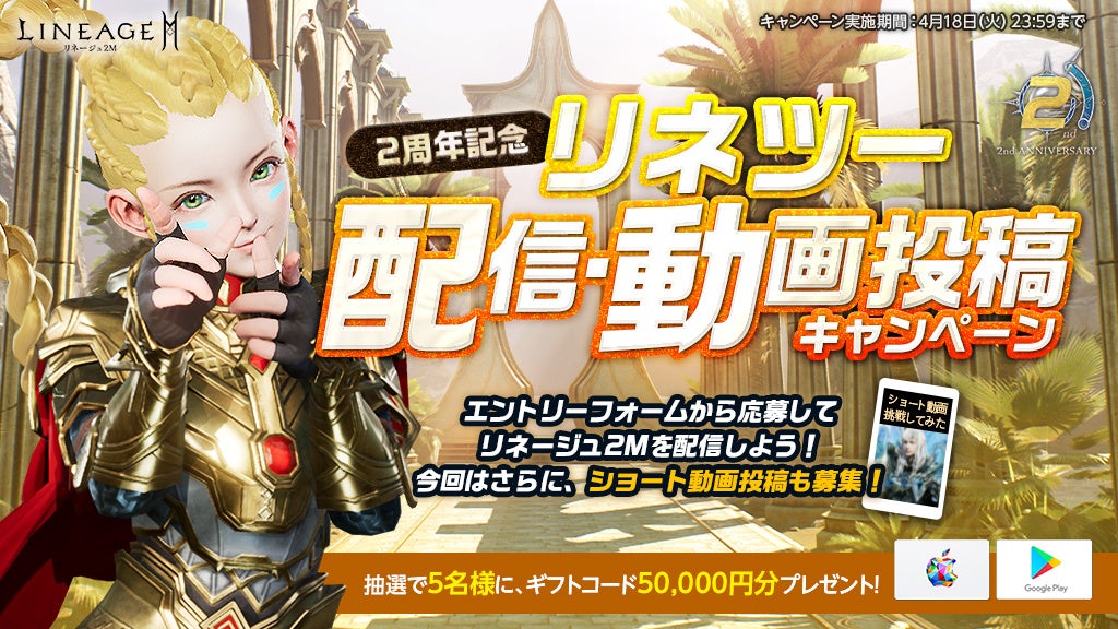 YouTubeで10分以上、リネージュ2Mのプレイ配信・動画投稿を行うか、ショート動画の投稿を行ったプレイヤーから抽選で5名様にギフトコード50,000円分をプレゼントします。