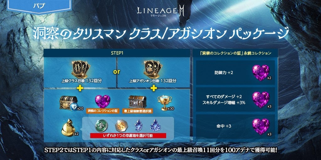 「神聖のタリスマン箱(刻印)」20個に、クラスまたはアガシオン召喚132回分、「洞察のコレクションの証(刻印)」などがセットになった「洞察のタリスマン クラス/アガシオン パッケージ」が登場しました。