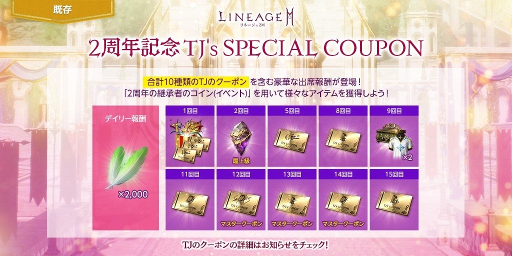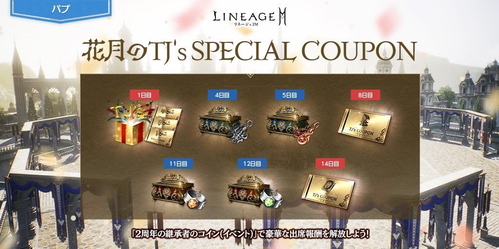 期間中、事前登録クーポンでの報酬またはショップ内のマイレージショップで獲得できる「2周年の継承者のコイン(イベント)」を使用してオープンすることができる出席報酬「花月のTJ’s SPECIAL COUPON 」が登場します。デイリー報酬として、「アインハザードの祝福」1,000のほか、「TJのクーポン:装備復旧(武器/防具/アクセサリー)」を獲得できる「TJのクーポン箱 – 復旧(イベント)」や合成履歴の最大等級の合成に再チャレンジできる「TJのクーポン:クラス」「TJのクーポン:アガシオン」などのアイテムを獲得できます。