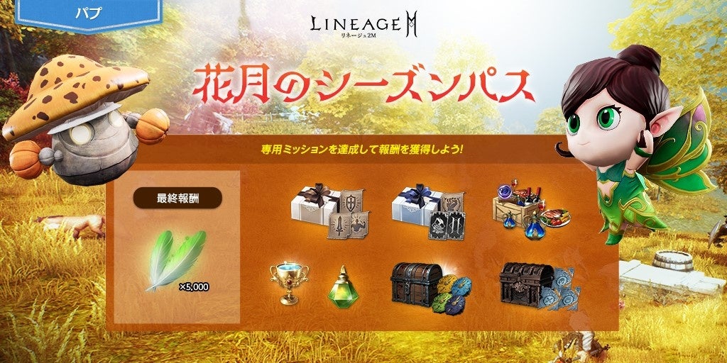 期間中、毎日達成していくデイリー ミッションと2週間でクリアを目指すシーズン ミッションで構成された、新規シーズンパス「花月のシーズンパス」が登場します。デイリー ミッション、シーズン ミッションをそれぞれ達成してシーズンパス EXPを獲得し、パス レベルを上昇させることで、「ダンジョン時間補充石選択箱(イベント)」や「パプリオンの召喚箱(イベント)」など、様々なアイテムを報酬として獲得することができます。また、1,000,000アデナを使用することでプレミアム報酬を有効化することができます。最終報酬として、「アインハザードの祝福」5,000を獲得することが可能です。