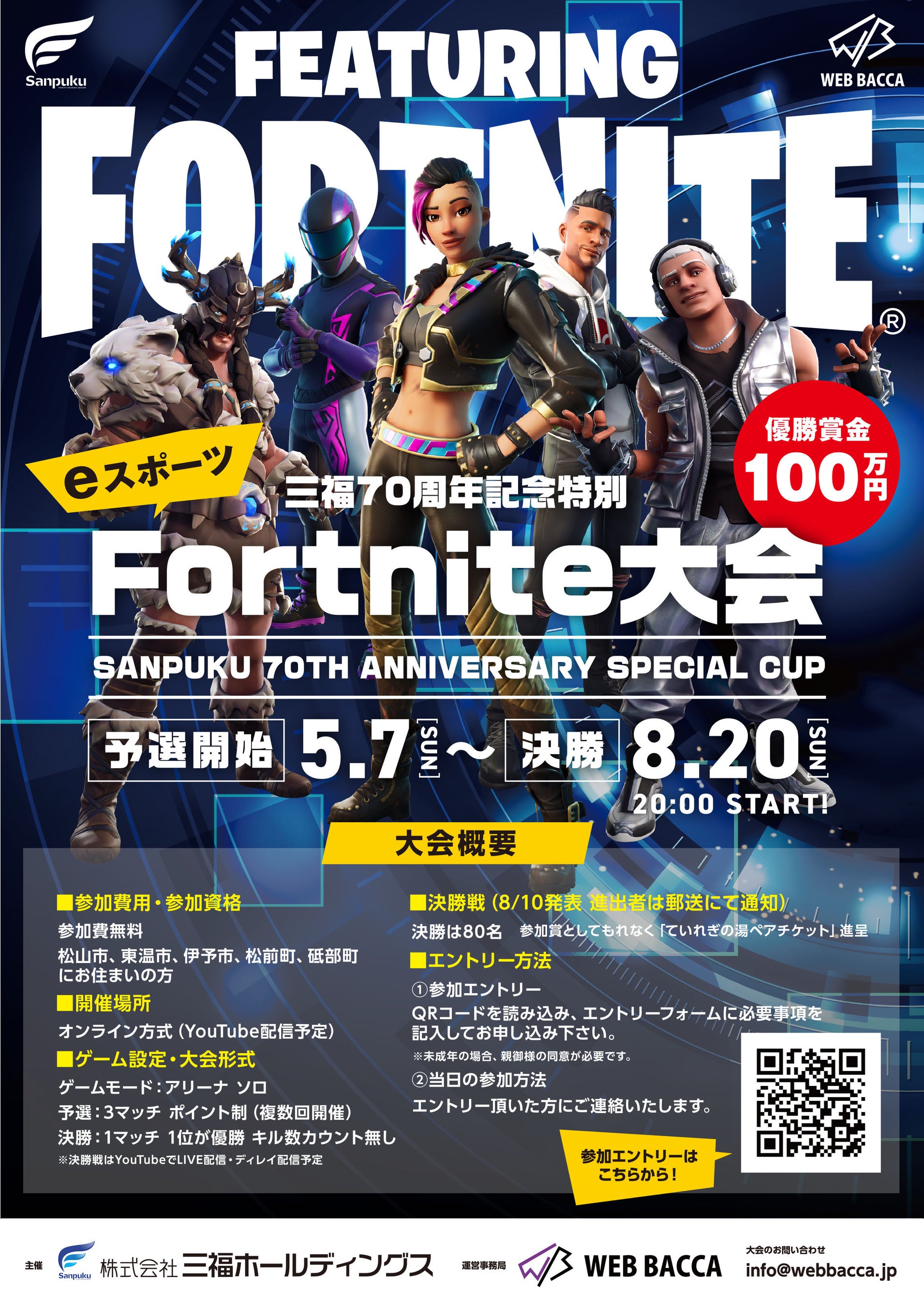 住宅商材に特化したインターネット販売を手掛けるジャストネット株式会社(所在地:愛媛県松山市、代表取締役:山本達也)が運営するプロeスポーツチーム「WEB BACCA」は、70周年を迎えた株式会社三福ホールディングス(所在地:愛媛県松山市、代表取締役:中矢孝則、以下 三福グループ)と地域貢献の一環として記念イベントのesports大会を開催いたします。