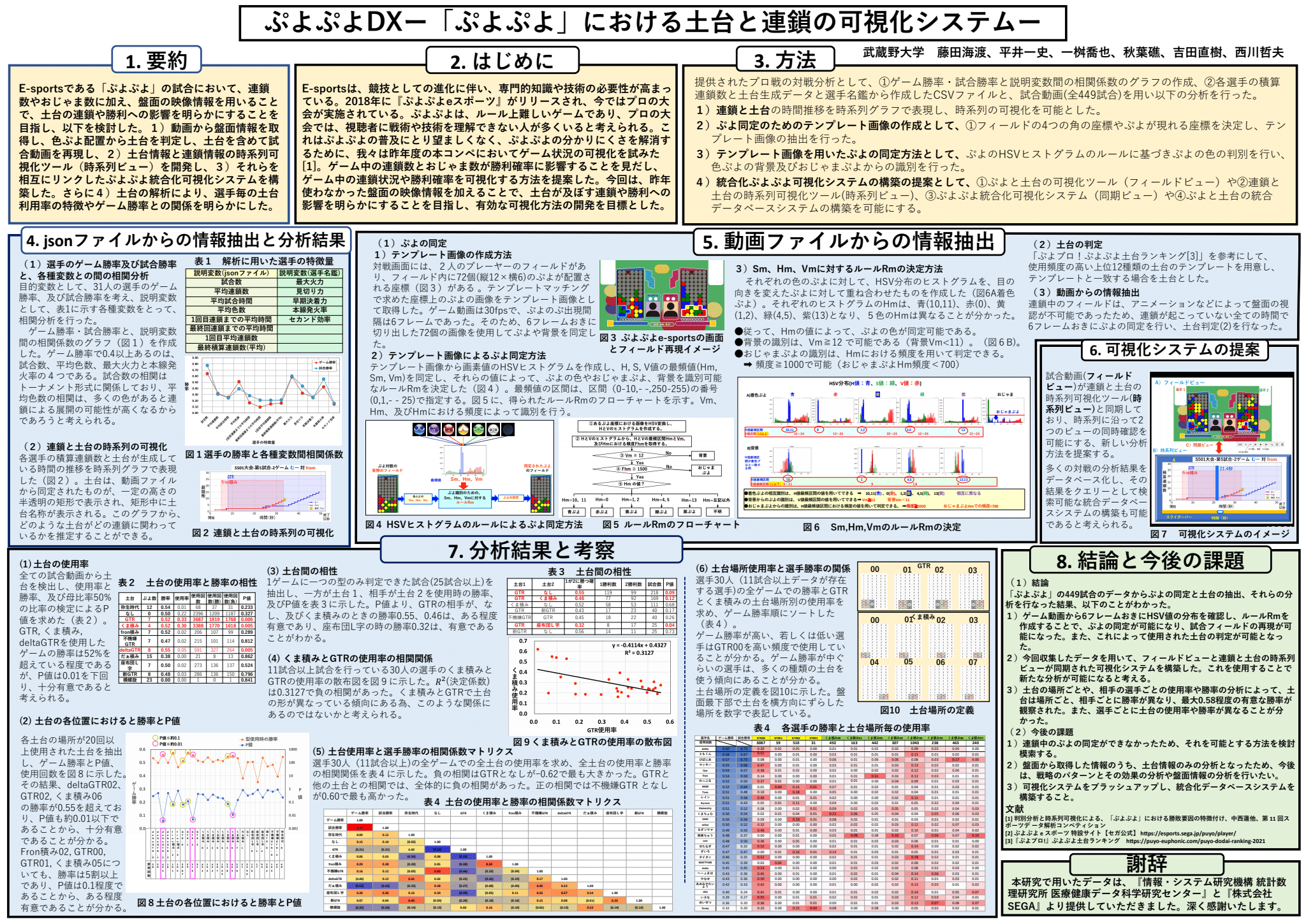 昨年度のコンペティションに引き続いて、今年度も「ぷよぷよeスポーツ」のデータや映像から価値ある分析結果等を競うesports部門を開催しました。参加チーム数は多くなかったものの、戦術分析のためのデータ生成手法や、観戦を盛り上げる演出に関するもの、土台に関する分析、プロ選手のタイプ分けと相性などのレベルの高い興味深い発表と、素晴らしいインフォグラフィック作品の提出がありました。