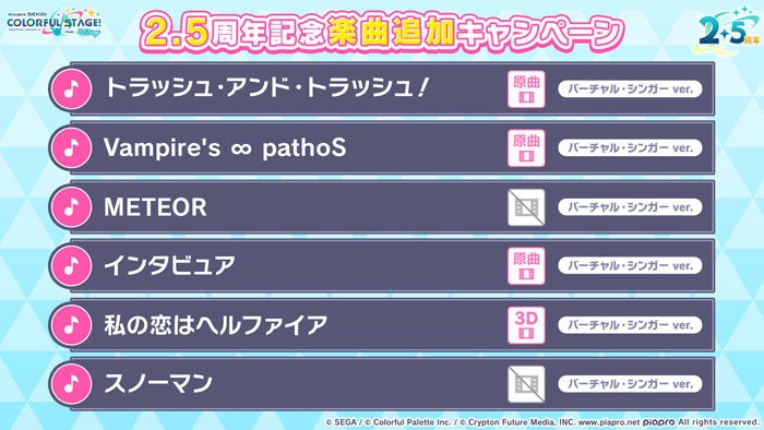「[2.5周年記念]楽曲追加キャンペーン」として、『プロジェクトセカイ』が2.5周年を迎える3月30日(木)より、6日間連続で下記の楽曲をゲーム内に追加いたします。