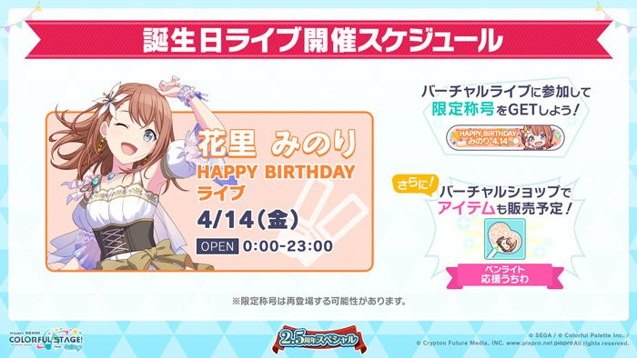 花里みのりの誕生日を記念して、バーチャルライブの開催が決定いたしました。バーチャルショップにてアイテムペンライト「応援うちわ」を販売予定です。今回も誕生日にあわせて「HAPPY BIRTHDAY ガチャ」を開催いたします。
