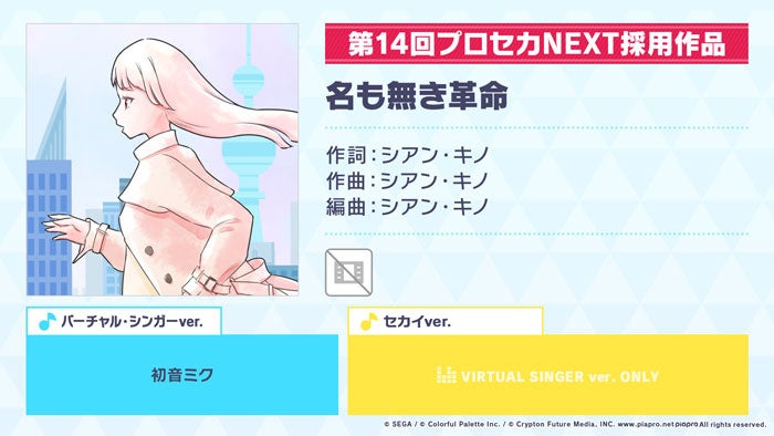 新たなリズムゲーム楽曲として、「名も無き革命」(作詞・作曲:シアン・キノ)の追加が決定いたしました。本楽曲は、「一緒に作ろう!第14回楽曲コンテストプロセカNEXT」の採用楽曲です。