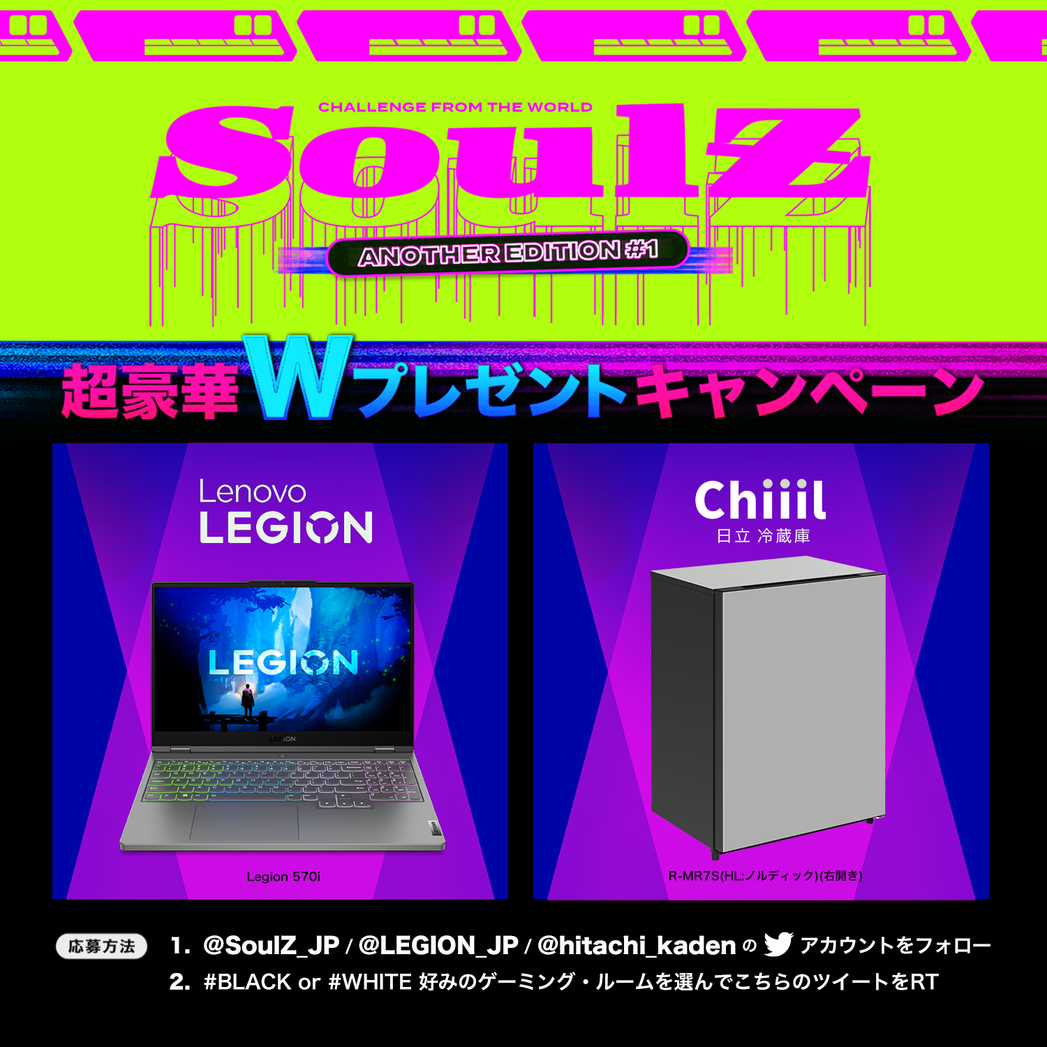 今大会を記念してハーフタイムショーで使用するSoulZオリジナル・ゲーミング・ルームと連動し、PCメーカー「Lenovo」のゲーミングノートPC「Legion 570i」と日立冷蔵庫「Chiiil」の商品がもらえる、Wプレゼントキャンペーンが、3月20日(月) 12:00pm 〜 4/3(月) 12:00pmの期間でSoulZ Official Twitterにて開催中!