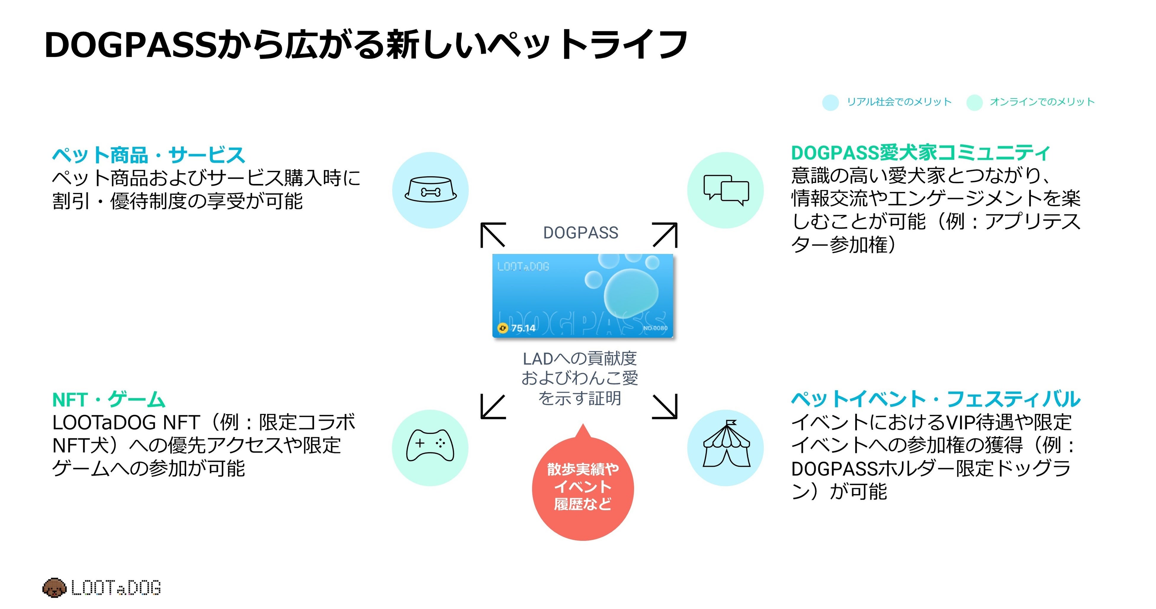 LOOTaDOGはワンちゃんとの日々の散歩をWalk-To-Ownという形でより楽しいアクティビティにするだけではなく、ゲーム内で飼い主様同士のコミュニケーションの場を提供する他、リアル店舗でのペットフードやペット用品の購入を行うサービスも今後導入予定があるなど、ワンちゃんとの生活をより豊かに出来るものです。