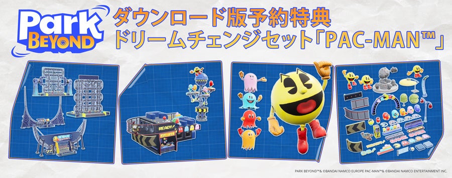 ダウンロード版の予約特典として、パークビヨンド:ドリームチェンジセット「PAC-MAN™」が付属します。PAC-MAN™をテーマにしたライド素材や、ショップアイテム、噴水、ベンチなど30種類以上の装飾アイテムが入っております。