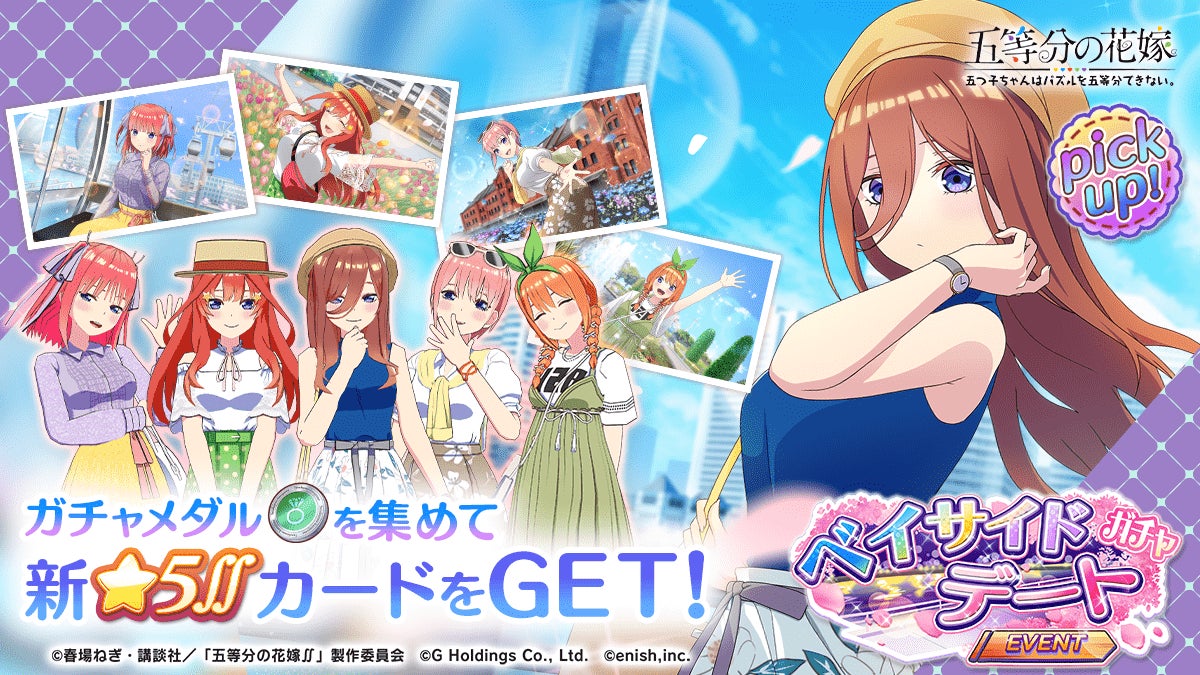 株式会社enish(本社:東京都港区、代表取締役社長:安徳 孝平、以下enish)は、2023年3月31日(金)より、アニメ「五等分の花嫁」初となるゲームアプリ『五等分の花嫁 五つ子ちゃんはパズルを五等分できない。』にて、週刊少年マガジン編集部完全監修のゲームオリジナルストーリーをお楽しみいただける新イベント「五つ子ちゃんとベイサイドデート~あなたと思い出を作りたい~」を開催いたします。