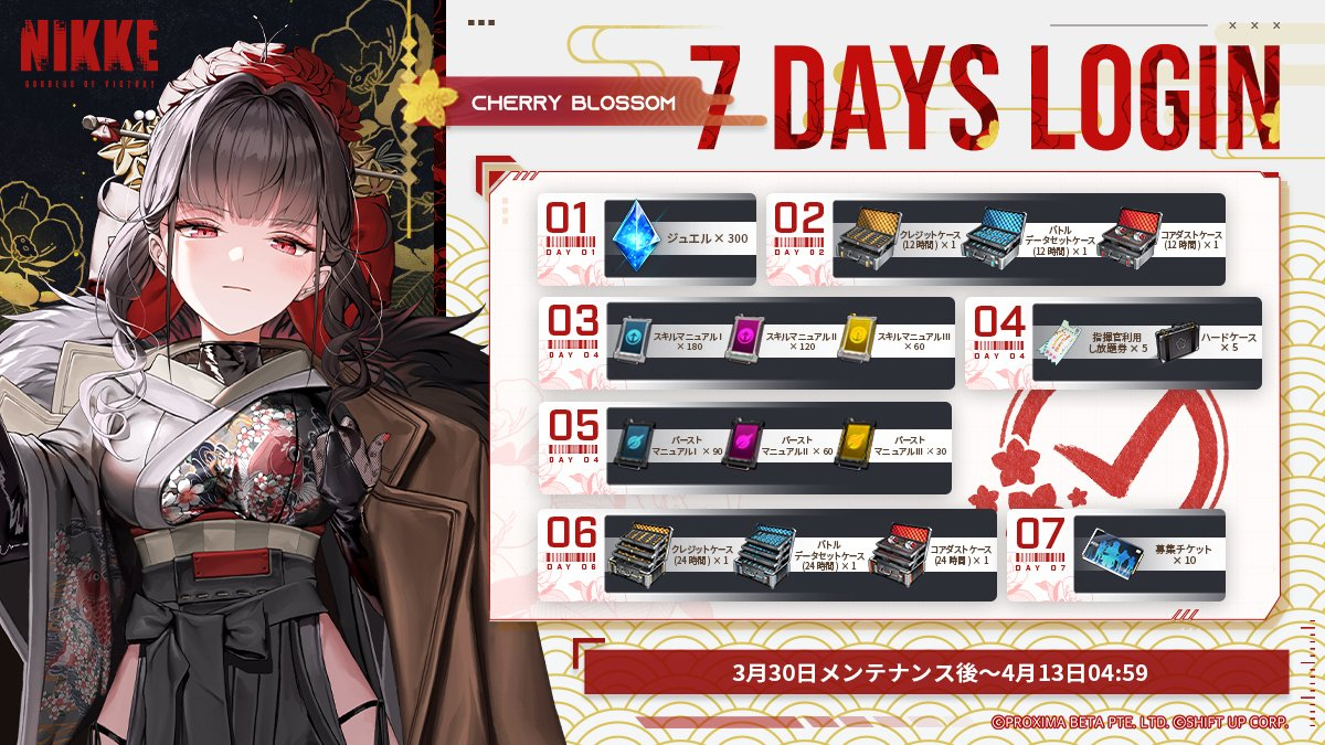 また、21日間のログインボーナスイベントをはじめ、新ストーリーイベント「Cherry Blossom」、報酬獲得量が2倍になる「週末限定 FULL BURST DAY イベント」など、アップデートを記念した様々な期間限定の新イベントを同時に開催します。