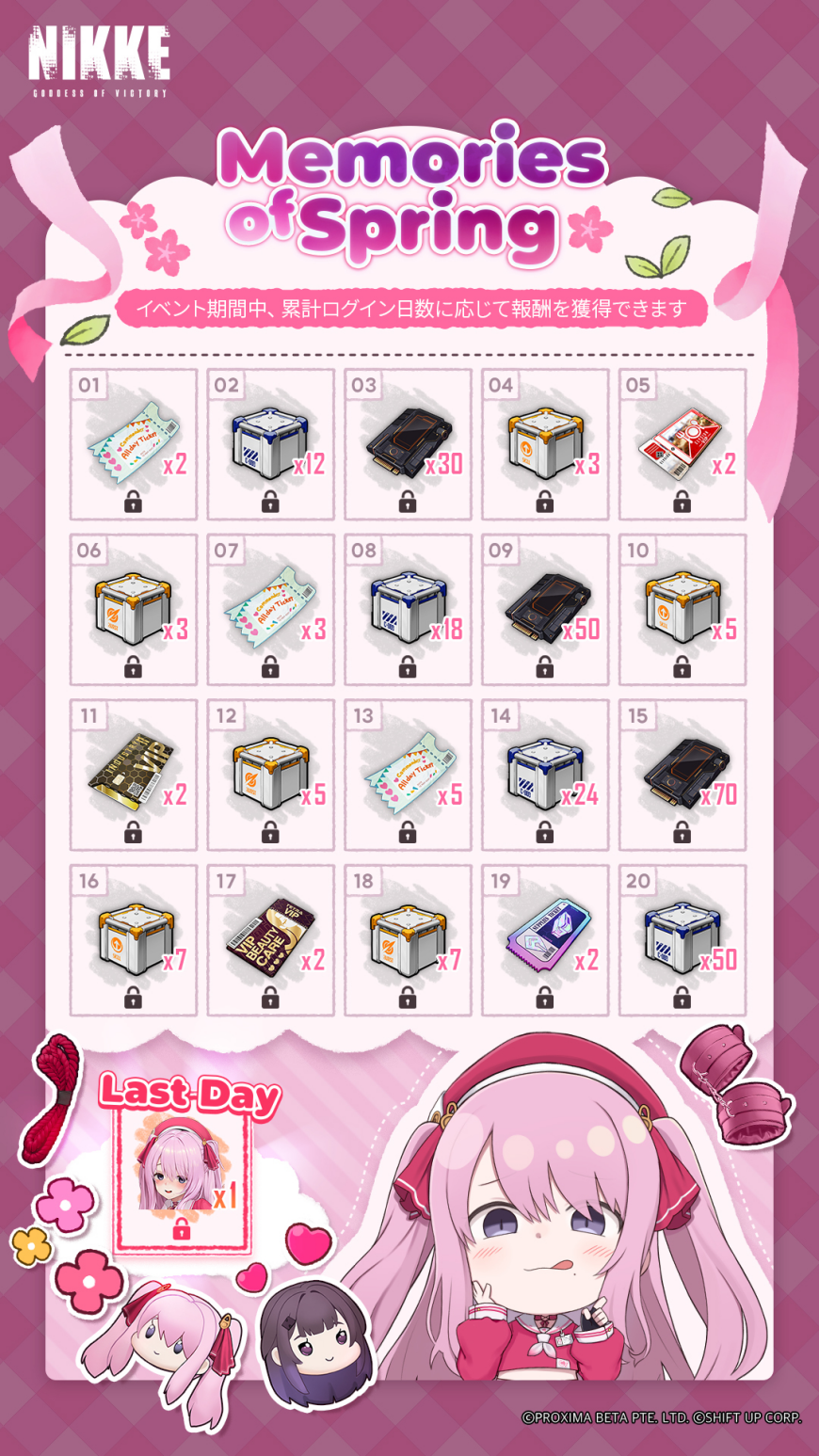 イベント開催期間中ゲームにログインすると、デイリー報酬を最大21日分獲得できます。21日間ログインするとユニの限定コスチューム「ラブリーピンク」や育成素材を含む様々な報酬を獲得できます。